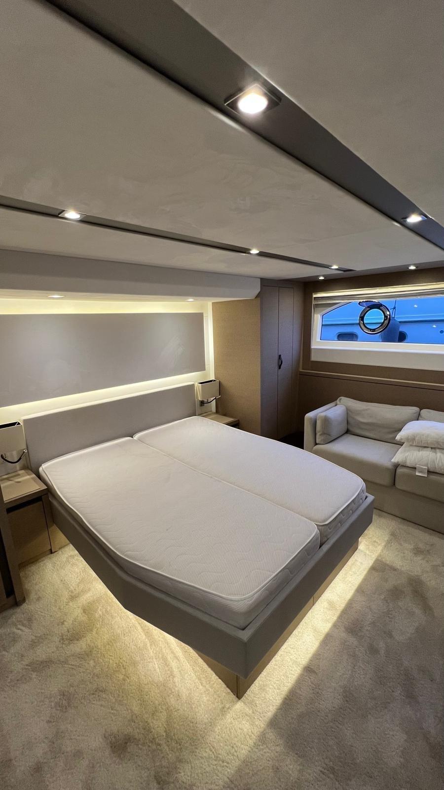 Le Prestige 630S dispose d’une vaste configuration à trois cabines, ainsi qu’une cabine d’équipage à l’arrière, accessible depuis la plateforme de baignade.