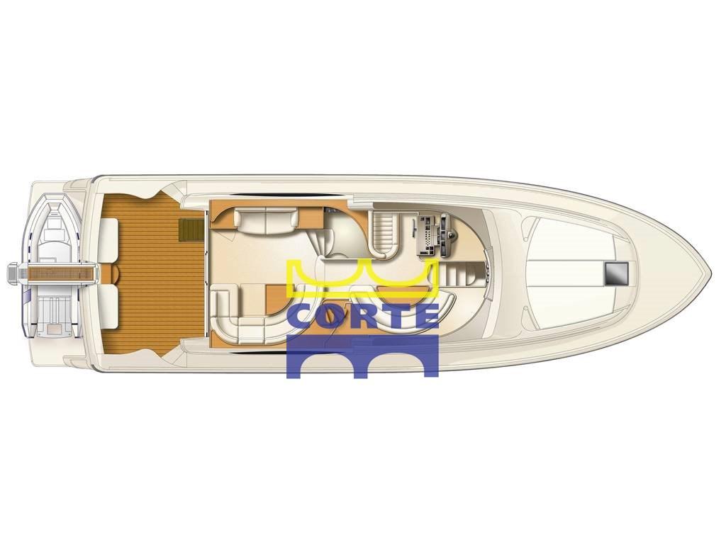 Alarme moteur, Alarme de pompe de cale, Eau sous pression, Douche de cockpit, Double barre à roue, Phare de poursuite, Flaps hydrauliques, Bossoirs pour annexe (passerella elettroidraulica), Extincteur(s) fixe(s), Lavabo dans le cockpit, Éclairage de courtoisie, Passerelle (estensibile in acciaio inox verniciato e teak con sollevamento elettroidraulico con telecomando), Plateforme arrière (/spoiler di poppa in teak con scala da bagno incorporata), Pompe de cale automatique, Porte latérale, Cockpit en teck, Prise de quai, Connexion eau sous pression à quai, Rollbar, Guindeau électrique, Echelle de bain (con maniglioni), table de cockpit, Corne, Winch électrique arrière, Winch électrique avant.