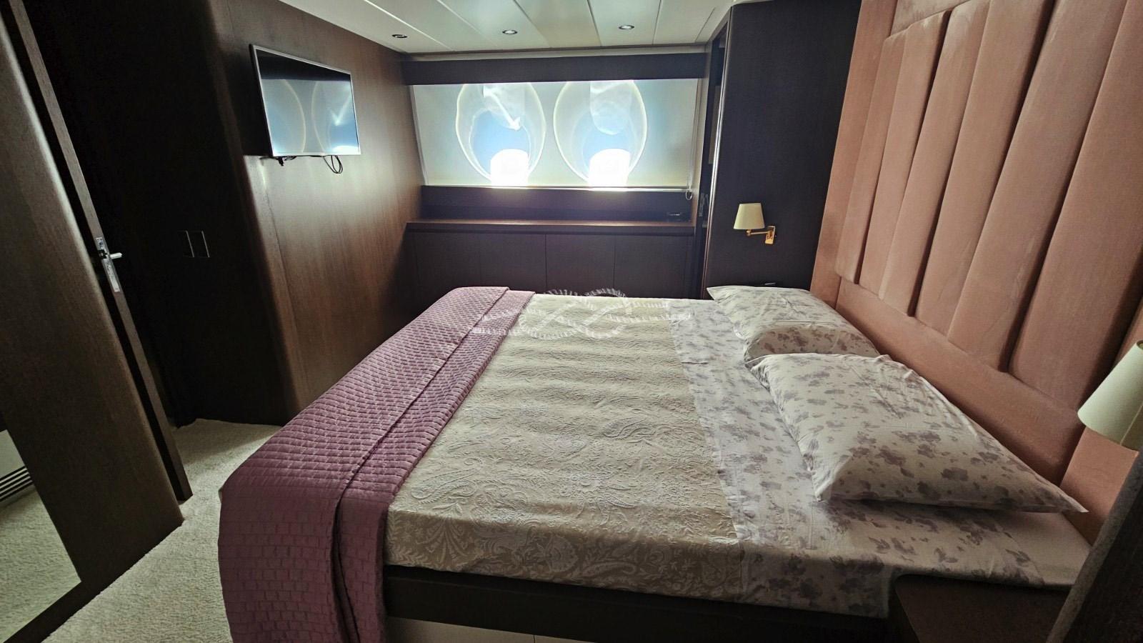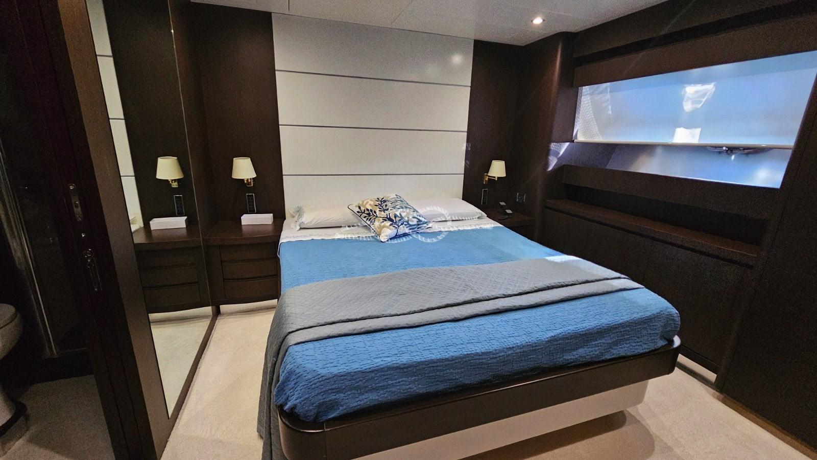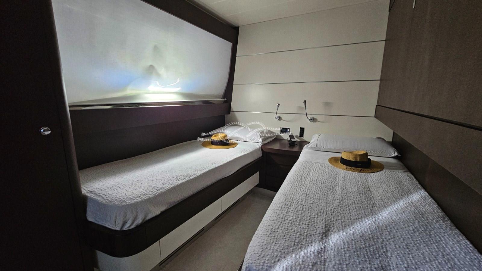 Cabine principale avec lit double, dressing et salle de bain - cabine VIP avec lit double et salle de bain - cabine d’amis avec lit double et salle de bain - cabine d’amis avec deux lits plats et salle de bain.