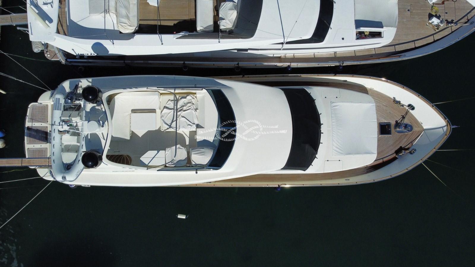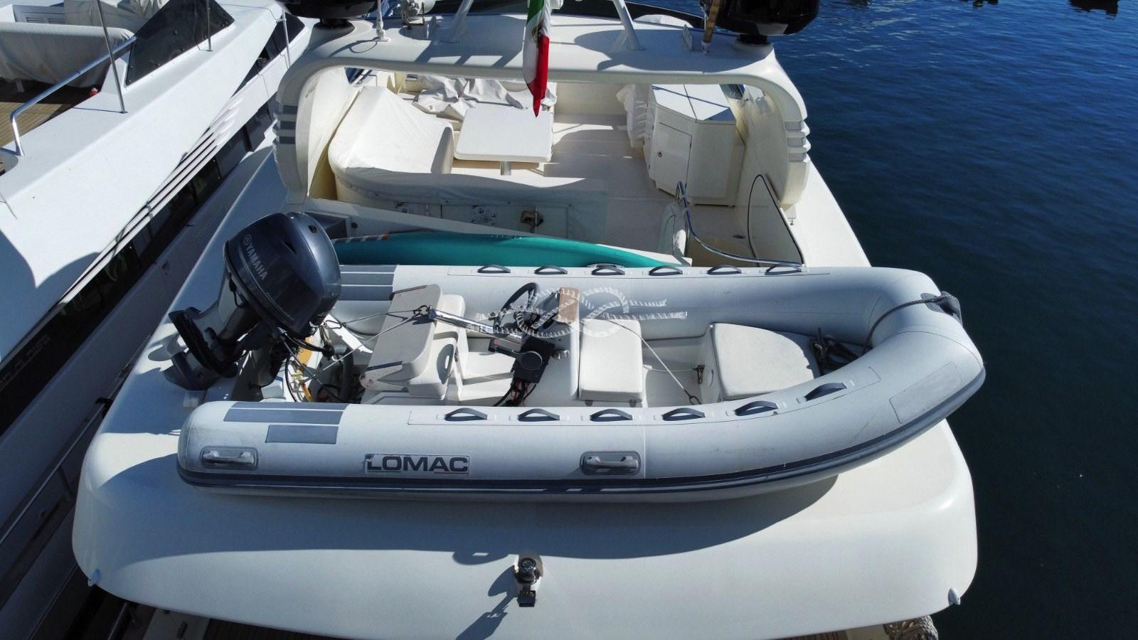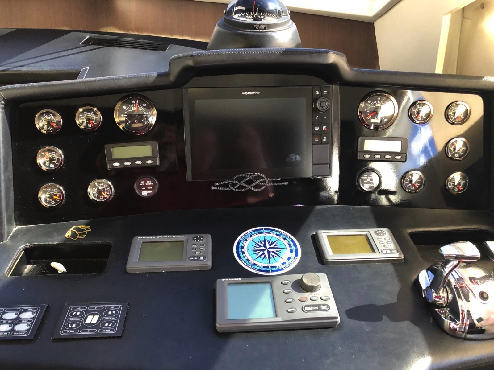 Alarme moteur, Alarme de pompe de cale, Eau sous pression, Système de vidange, Passavant en teck, Douche de cockpit, Double barre à roue, Phare de poursuite, Flaps hydrauliques, Grue de flybridge, Extincteur(s) fixe(s), Indicateurs de flaps, Lavage de chaine, Éclairage de courtoisie, Passerelle, Prise de quai, Connexion eau sous pression à quai, Onduleur, Guindeau électrique, Echelle de bain, table de cockpit, Corne, Winch électrique arrière.