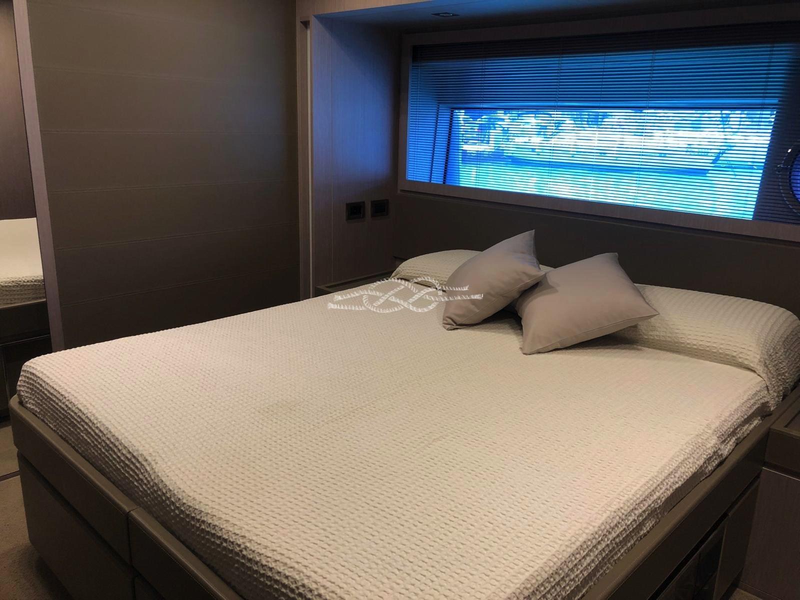 Cabine principale avec lit double, dressing, salle de bain - cabine VIP avec lit double et salle de bain - cabine d’invités avec lit double et salle de bain - cabine d’invités avec deux lits plats - salle de bain invités.