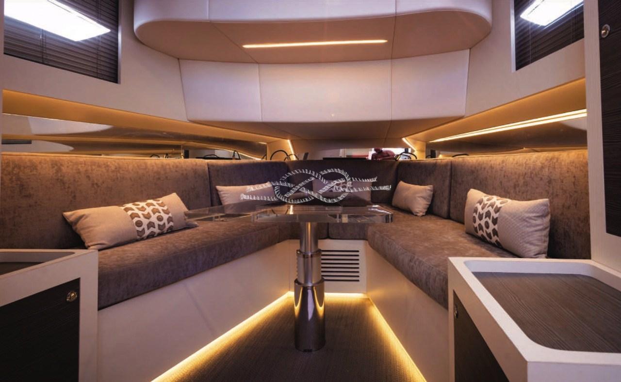 Alarme moteur, Alarme de pompe de cale, Eau sous pression, Passavant en teck, Couleur spéciale, Douche de cockpit, Flaps hydrauliques, Indicateurs de flaps, Éclairage de courtoisie, Spots sous-marins, Passerelle, Pompe de cale automatique, Pompe de cale manuelle, Cockpit en teck (Sintetico), Prise de quai, Connexion eau sous pression à quai, Guindeau électrique, Echelle de bain, table de cockpit, Table pliante de salon, Filières avec sortie latèrale, Corne, T-Top.