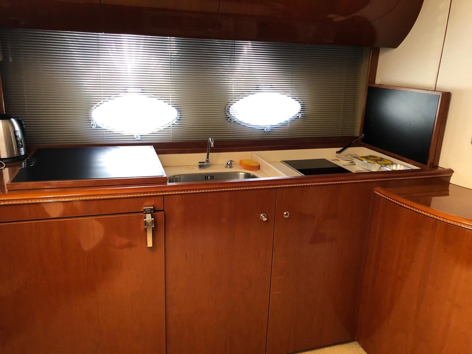 Climatisation - dessalinisateur - groupe électrogène 9 kW - passerelle électro-hydraulique - garage à annexe - propulseur d’étrave - annexe avec hors-bord - réfrigérateur - meuble bar dans le cockpit avec réfrigérateur, plaque de cuisson électrique et évier.