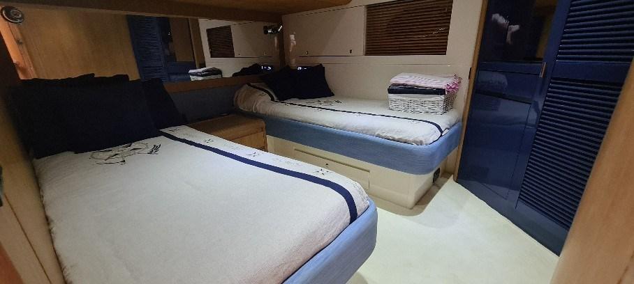 Cabine principale avec lit double et salle de bain - cabine d’invités avec deux lits plats et salle de bain - dinette avec kitchenette.