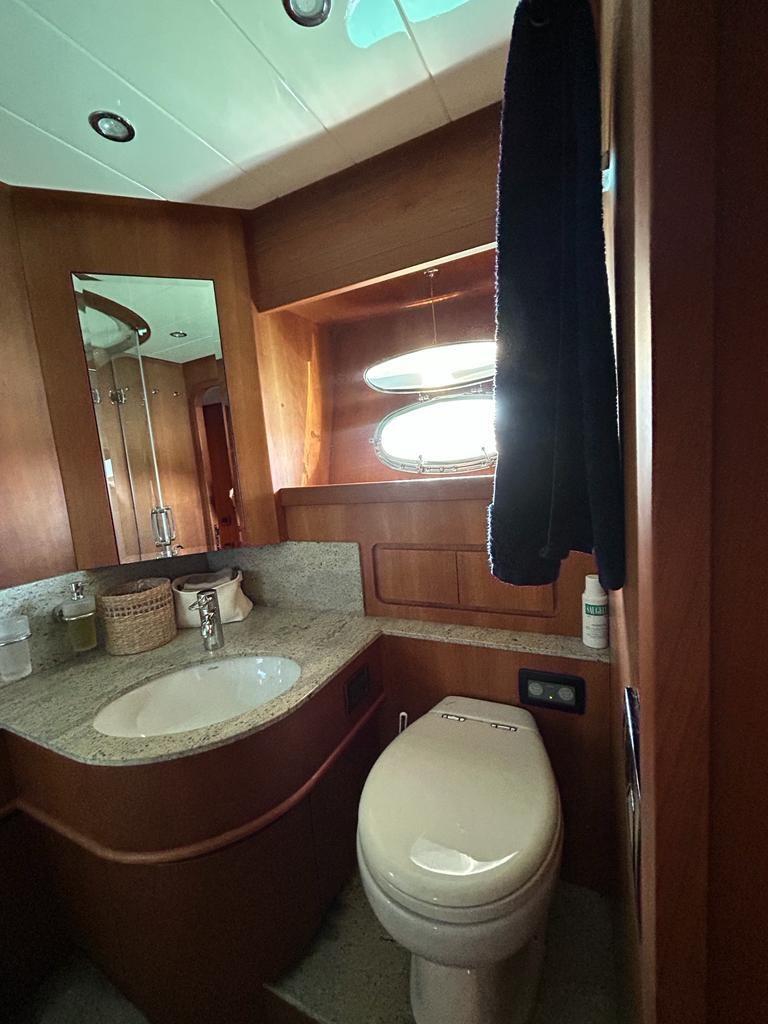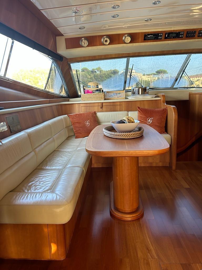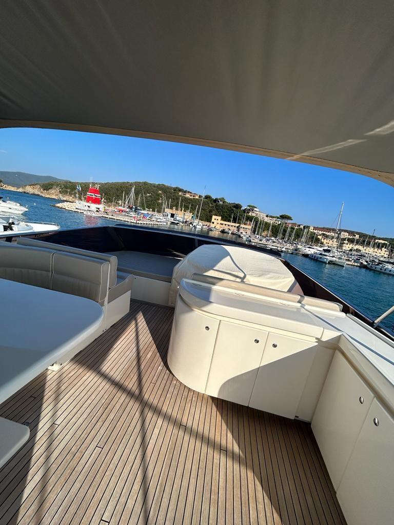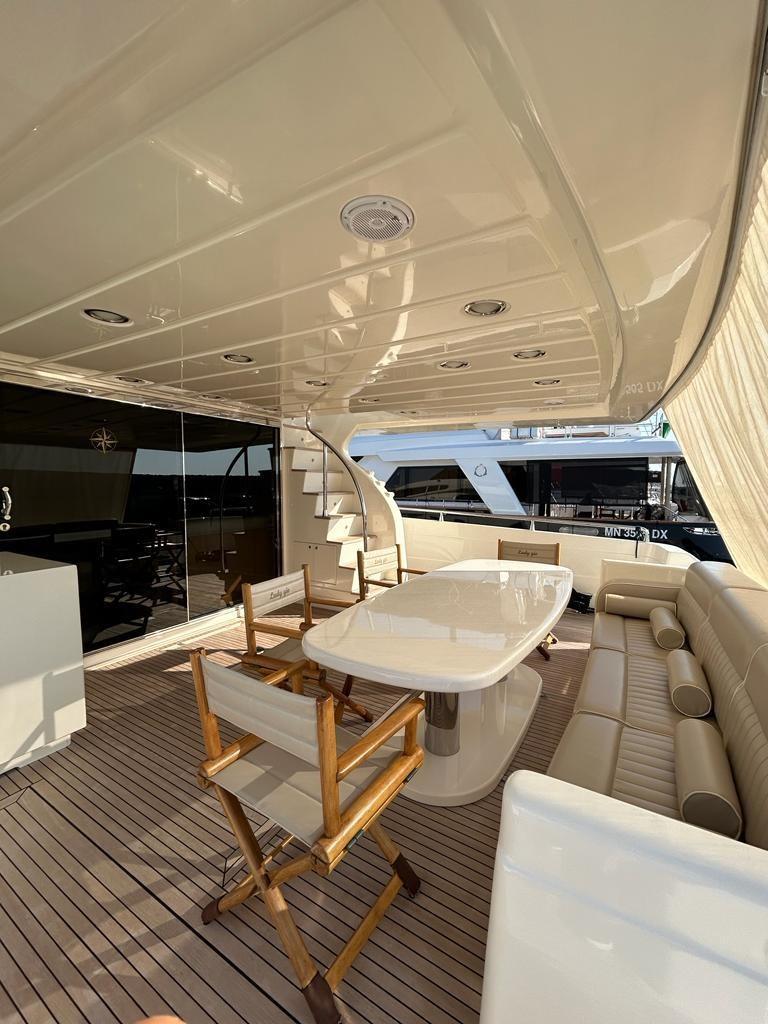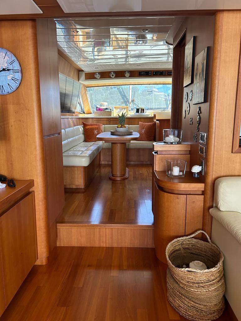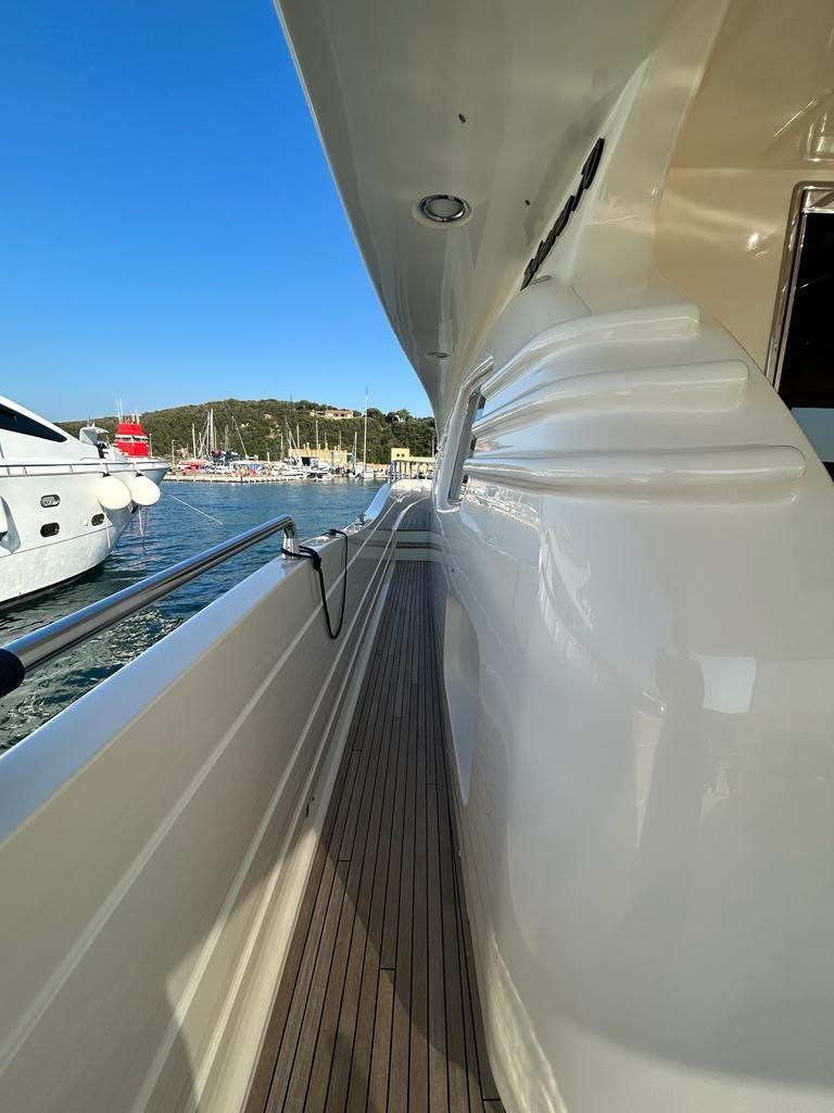 Alarme gaz, Alarme moteur, Alarme de pompe de cale, Eau sous pression, Passavant en teck, Flaps hydrauliques, Grue de flybridge, Extincteur(s) fixe(s), Indicateurs de flaps, Éclairage de courtoisie, Spots sous-marins, Passerelle, Pompe de cale automatique, Porte latérale, Porte latérale, Cockpit en teck, Prise de quai, Connexion eau sous pression à quai, Onduleur, Rollbar, Guindeau électrique, Echelle de bain, table de cockpit, Winch électrique arrière, Winch électrique avant.