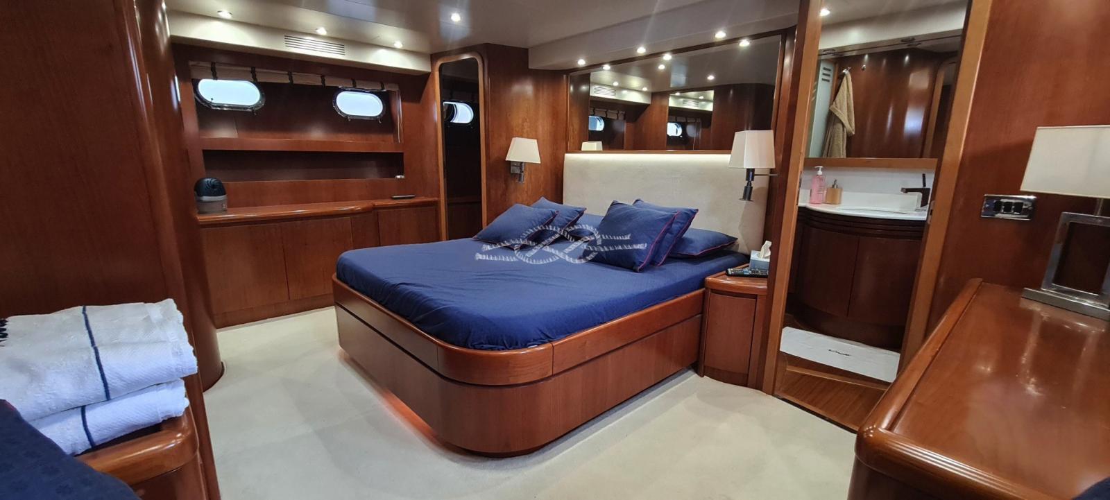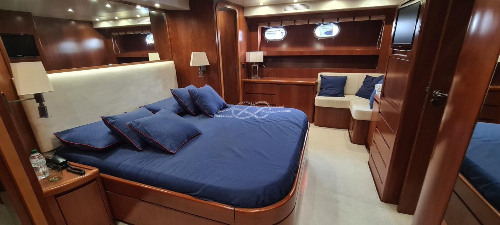 Salon avec canapé en L et table à manger - toilettes de jour - pont avec dinette - cuisine - cabine principale avec lit double, salle de bain avec douche séparée, dressing - cabine VIP avec lit double, salle de bain avec douche séparée, armoire - cabine d’invités avec lit français, lit pullman, salle de bain et douche séparée - cabine d’invités avec lits plats, lit pullman, salle de bain avec douche séparée.
