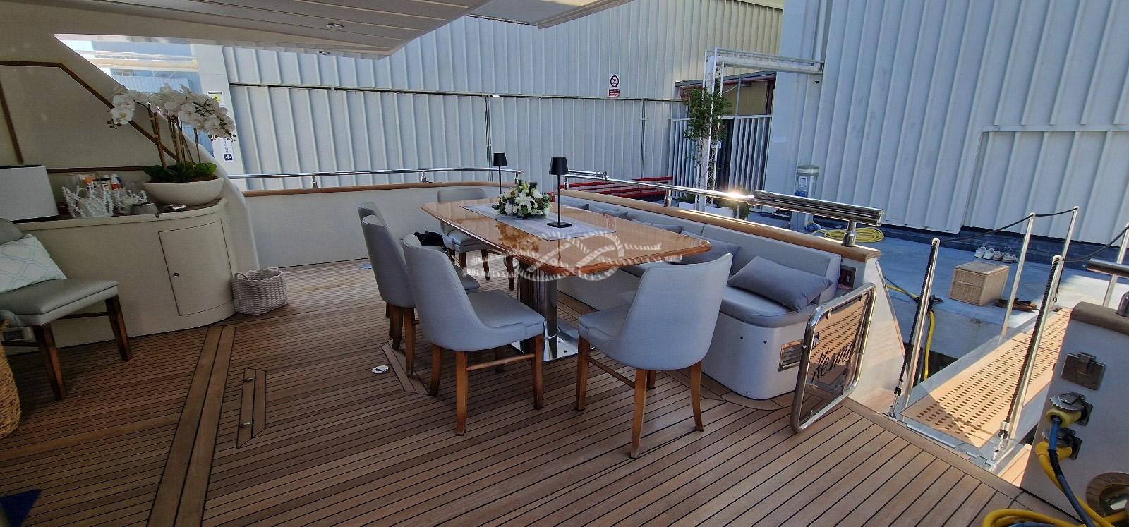 2020-2021 : rénovation complète du teck du pont principal et du flying bridge - remise à neuf de toute la sellerie intérieure et extérieure - polissage complet du bateau - meulage de la ligne d’arbre (essieux, hélices) - remplacement des bagues de portique - nouveau propulseur d’étrave.
