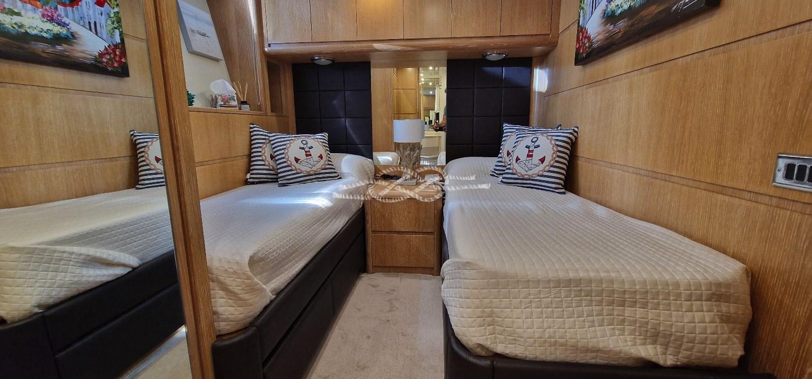 Cabine principale avec lit double, dressing et salle de bain - Cabine VIP avec lit double et salle de bain - Cabine invités avec lit double et salle de bain - Cabine invités avec deux lits séparés et salle de bain - Cabine équipage avec installations.