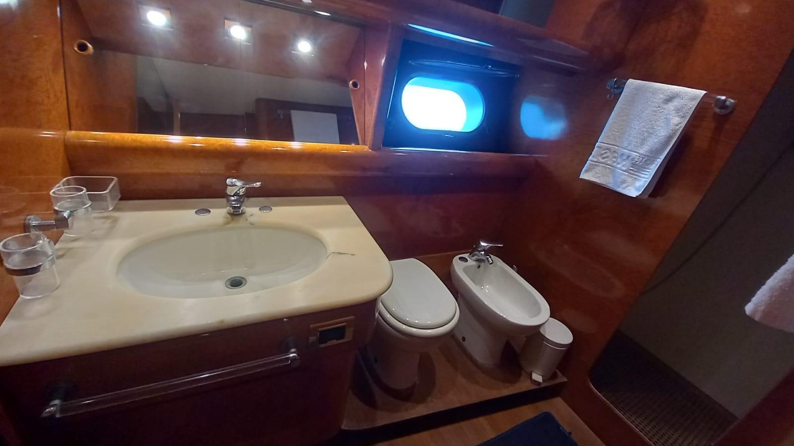 Alarme moteur, Alarme de pompe de cale, Eau sous pression, 16 Batteries, Système de vidange, Passavant en teck, Douche de cockpit, Double barre à roue, Flaps hydrauliques, Grue de flybridge, Extincteur(s) fixe(s), Indicateurs de flaps, Lavage de chaine, Spots sous-marins, Passerelle (elettro idraulica), Plateforme arrière, Porte latérale, Porte latérale, Cockpit en teck, Prise de quai, Connexion eau sous pression à quai, Rollbar, Guindeau électrique, Echelle de bain, Selles pour Annexe, table de cockpit, Annexe, Corne, Winch électrique arrière.