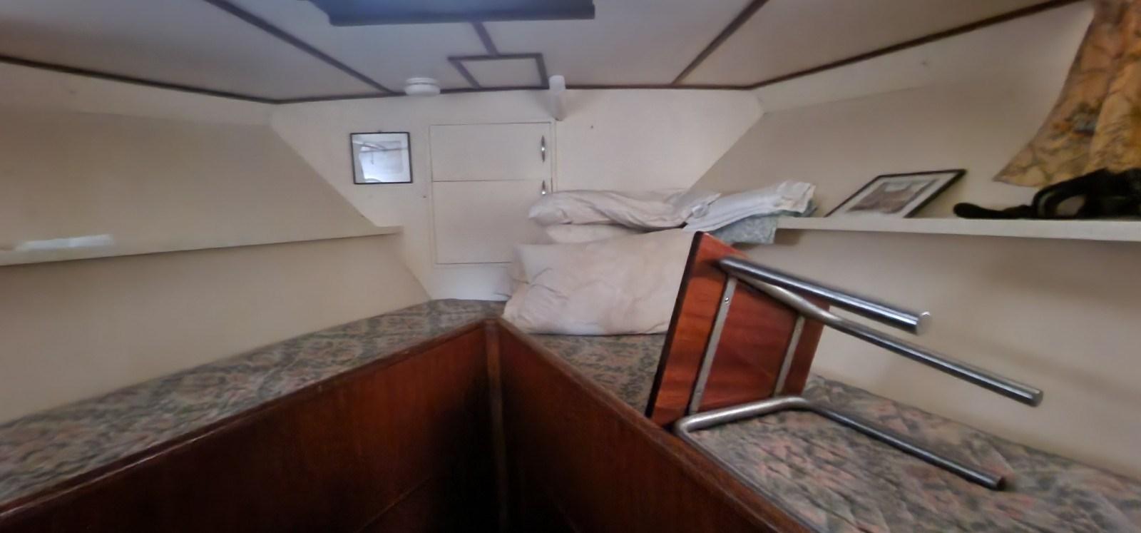Cabine principale arrière avec salle de bains attenante - salon au milieu des navires - coin repas et cuisine équipée - cabine invités à l’avant avec deux lits en V - salle de bains invités.