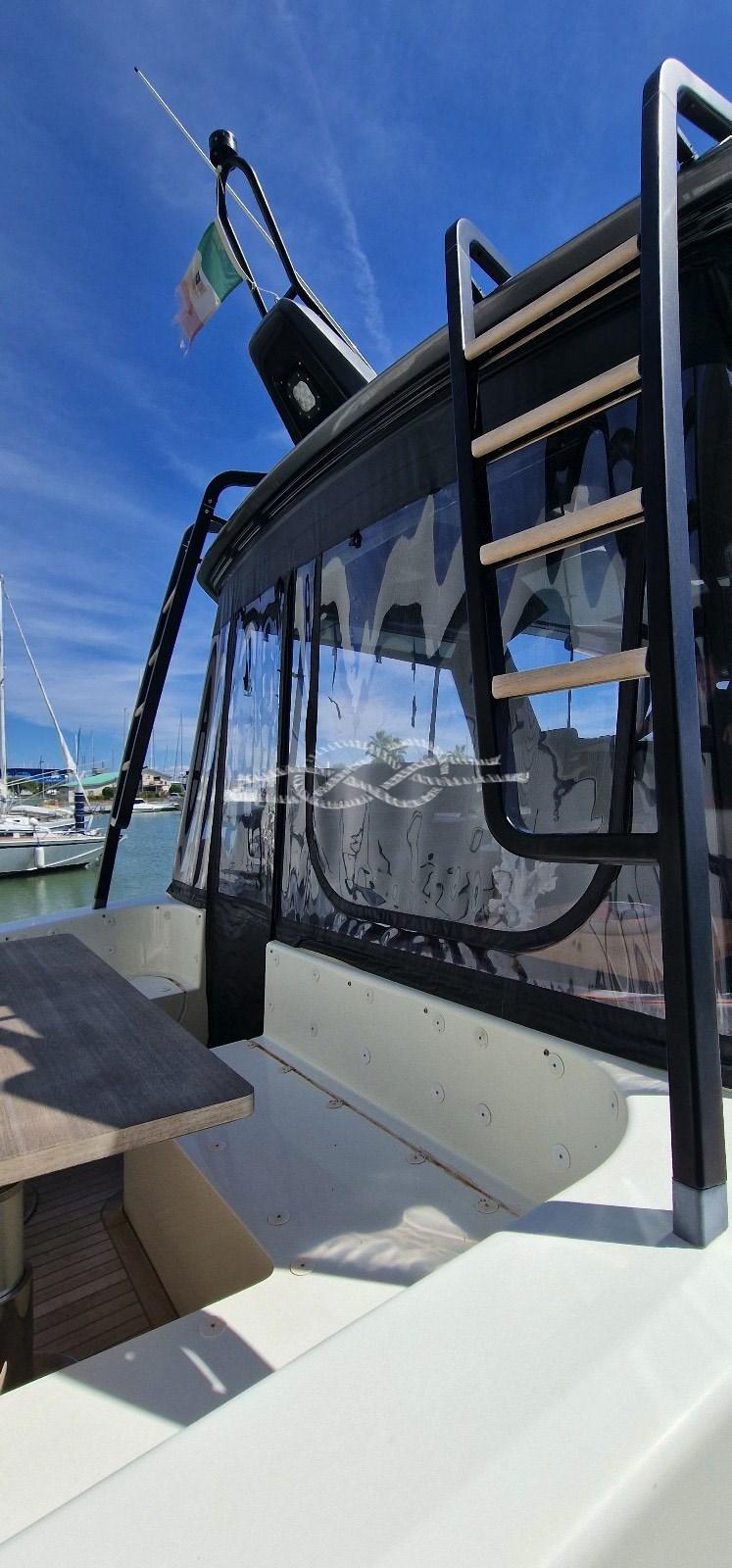 Alarme moteur, Alarme de pompe de cale, Eau sous pression, Passavant en teck, Douche de cockpit, Flaps hydrauliques, Hard top, Extincteur(s) fixe(s), Éclairage de courtoisie, Spots sous-marins, Passerelle, Plateforme arrière, Pompe de cale automatique, Cockpit en teck, Prise de quai, Connexion eau sous pression à quai, Guindeau électrique, Echelle de bain, table de cockpit, Corne, Winch électrique arrière.
