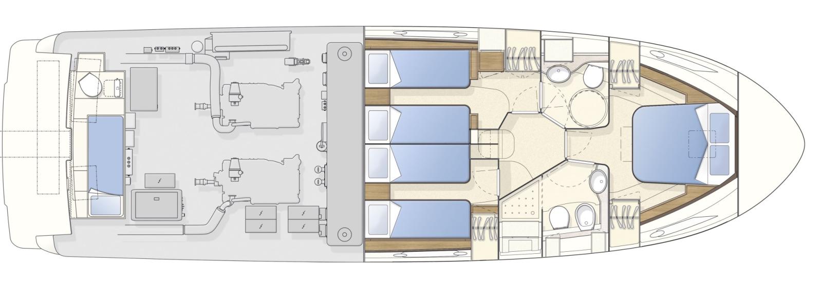 Cabine principale avec lit double et salle de bain - cabine d’invités avec deux lits à l’étage - cabine d’invités avec deux lits à l’étage - salle de bain d’invités.