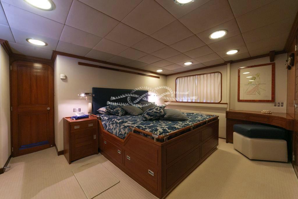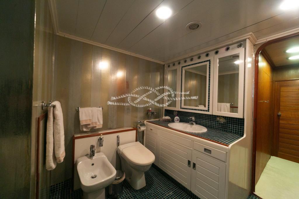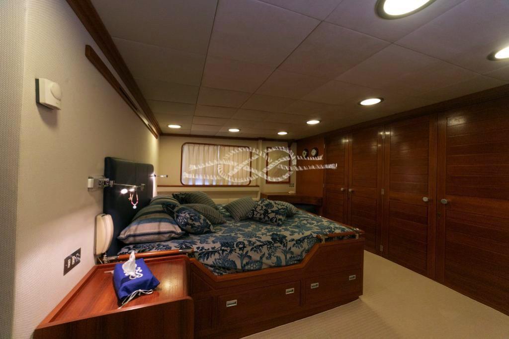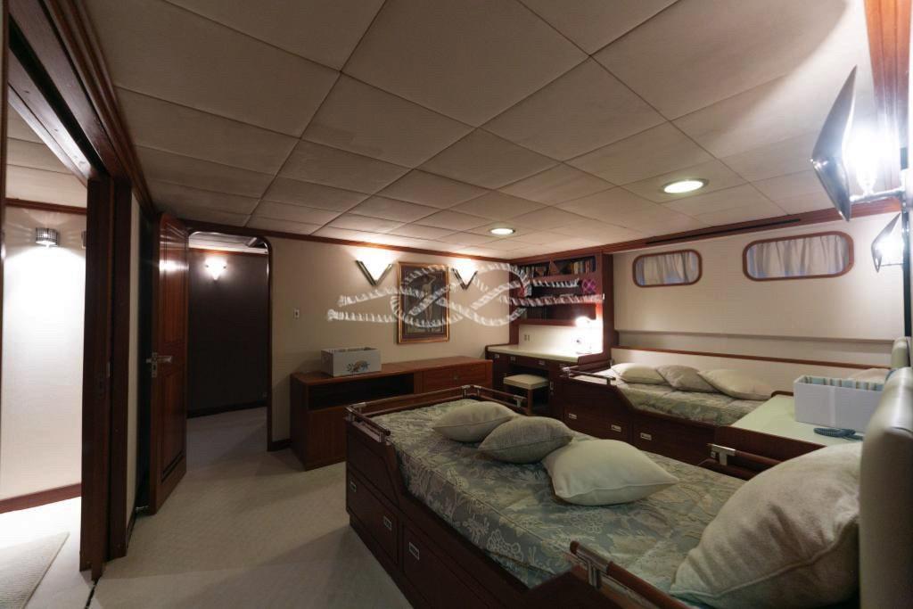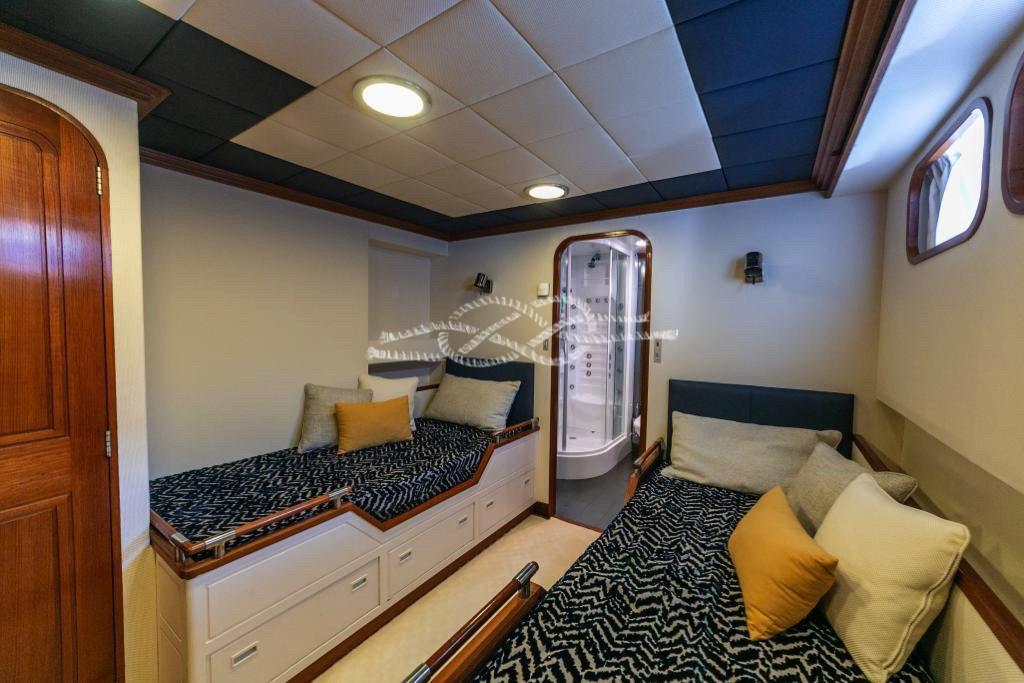 Cabine principale sur le pont principal avec lit double et salle de bain - Cabine VIP avec deux lits et salle de bain - Cabine invités avec deux lits plats et salle de bain - Cabine invités avec deux lits plats et salle de bain.