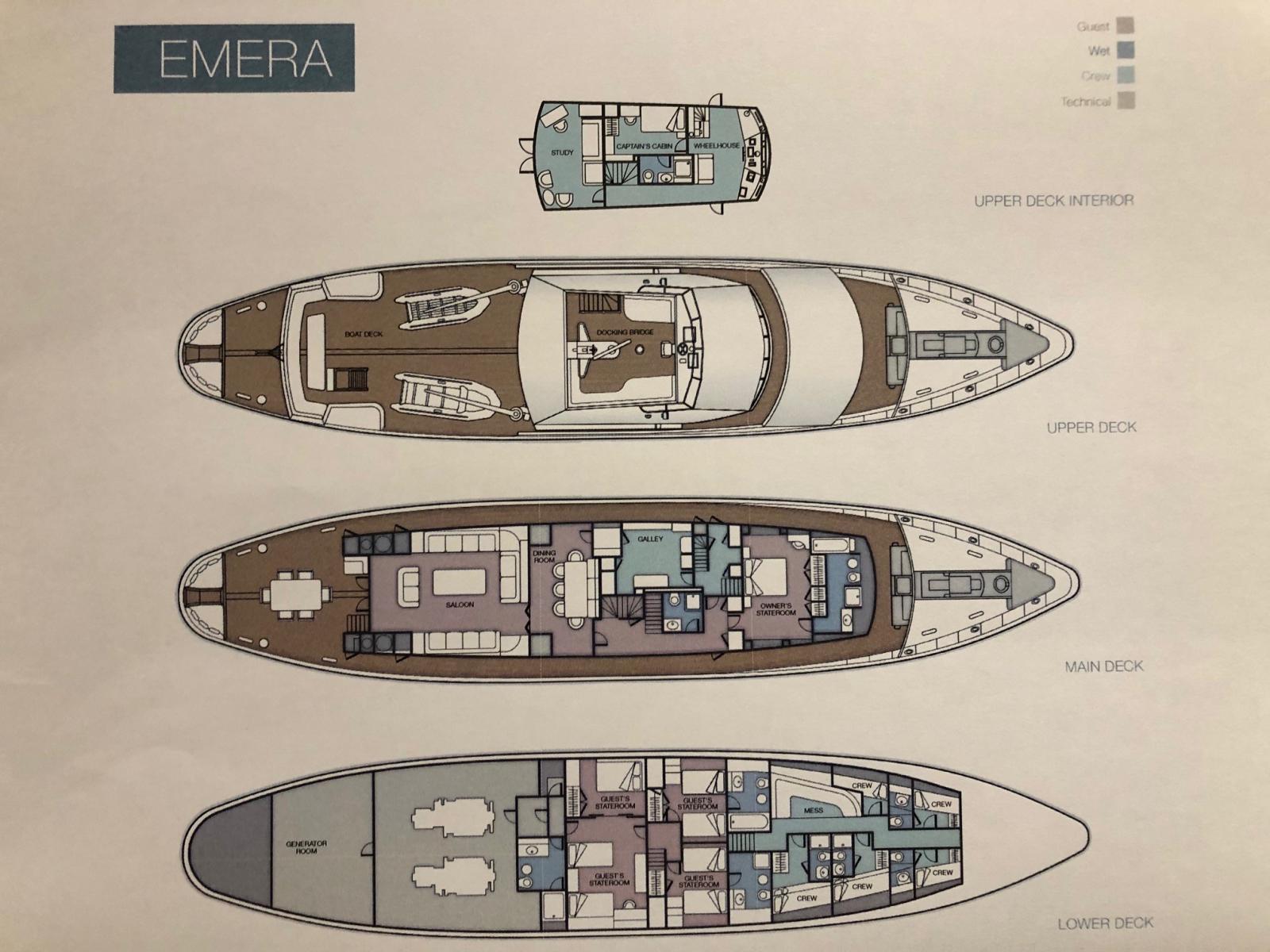 Climatisation centrale - Dessalinisateur Tecnomarine 500 L/h - Séparateur diesel Alfa Laval 900 L/h - Propulseur d’étrave hydraulique 60 kW - plaque à induction - four - Frigo congélateur en acier - Deux machines à laver Miele - Deux sèche-linge Miele - Antenne TV SAT - Système stéréo Technics - Annexe Novamarine 5,30 m avec Volvo Penta 130 Hp inboard - Annexe Novamarine 4,60 m avec hors-bord Yamaha 60 Hp - Epirb - Système de traitement des eaux noires Hamman - Système de purification diesel Alfa Laval - Données SAT et Wi-Fi - deux générateurs Caterpillar de 150 kW (3569 - 3462 heures).