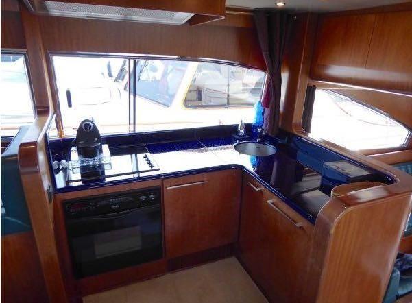 Grand salon avec canapés en cuir - salle à manger avec cuisine - timonerie interne et flybridge - grand cockpit.