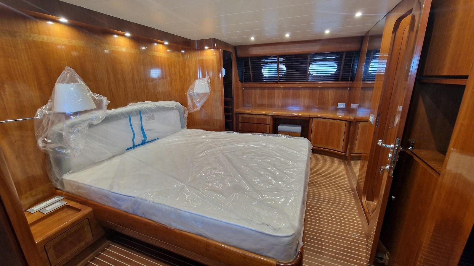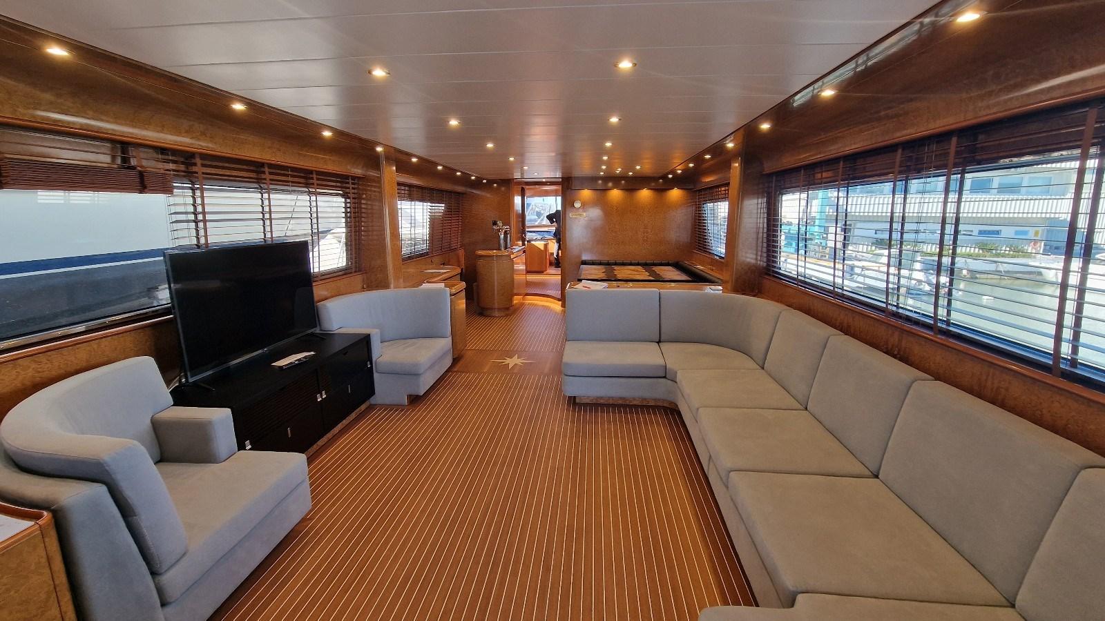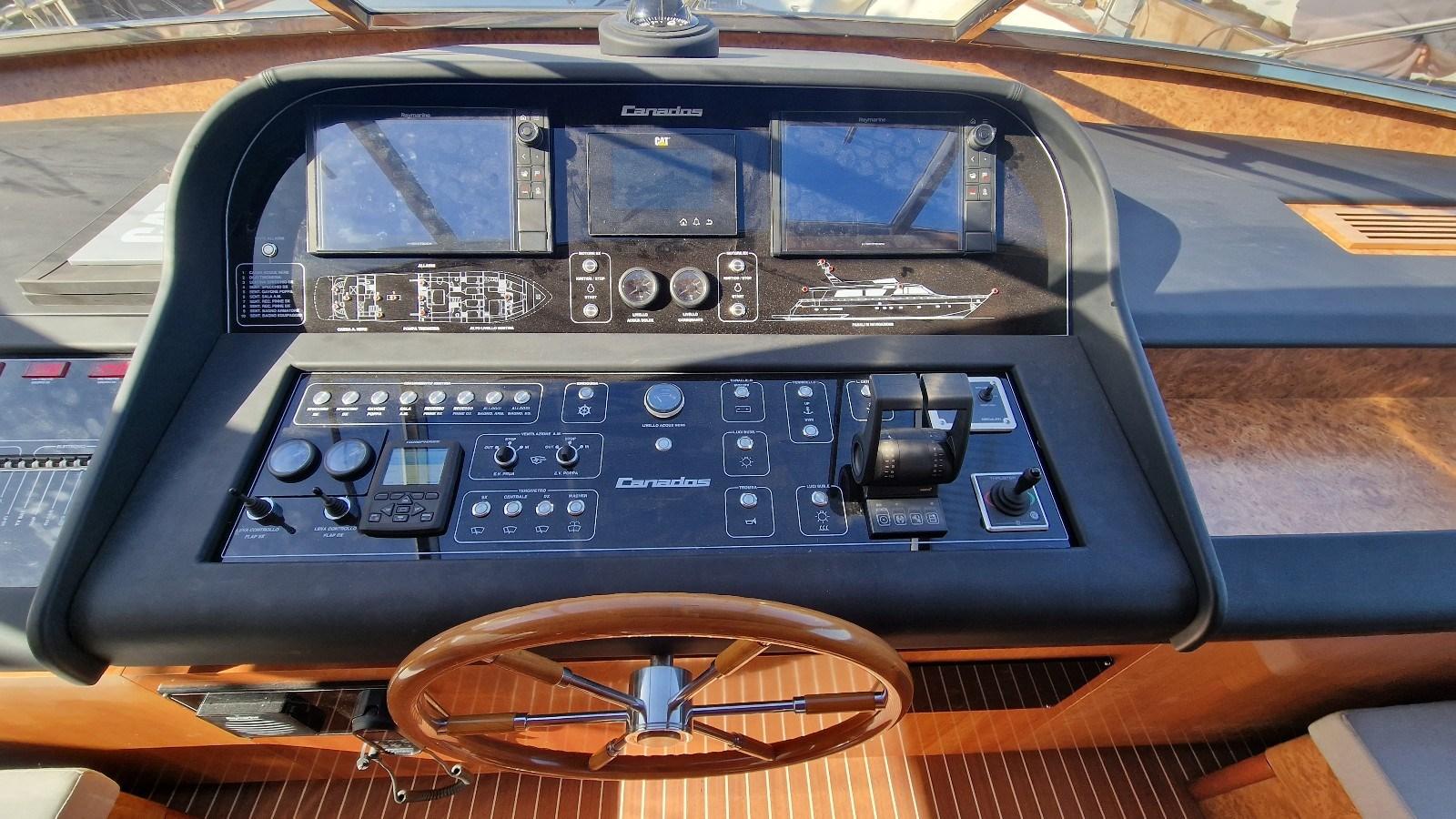 Bateau qui vient d’achever un carénage total (peinture, système électrique, coque à zéro, remplacement des moteurs avec le n°2 CAT de 1 670 ch chacun, ailerons stabilisateurs, élévateur d’annexe avec plate-forme arrière surdimensionnée, poupe reconstruite avec échelles, etc.).