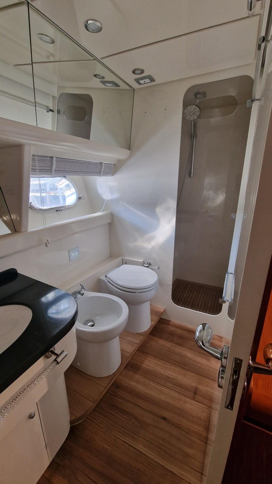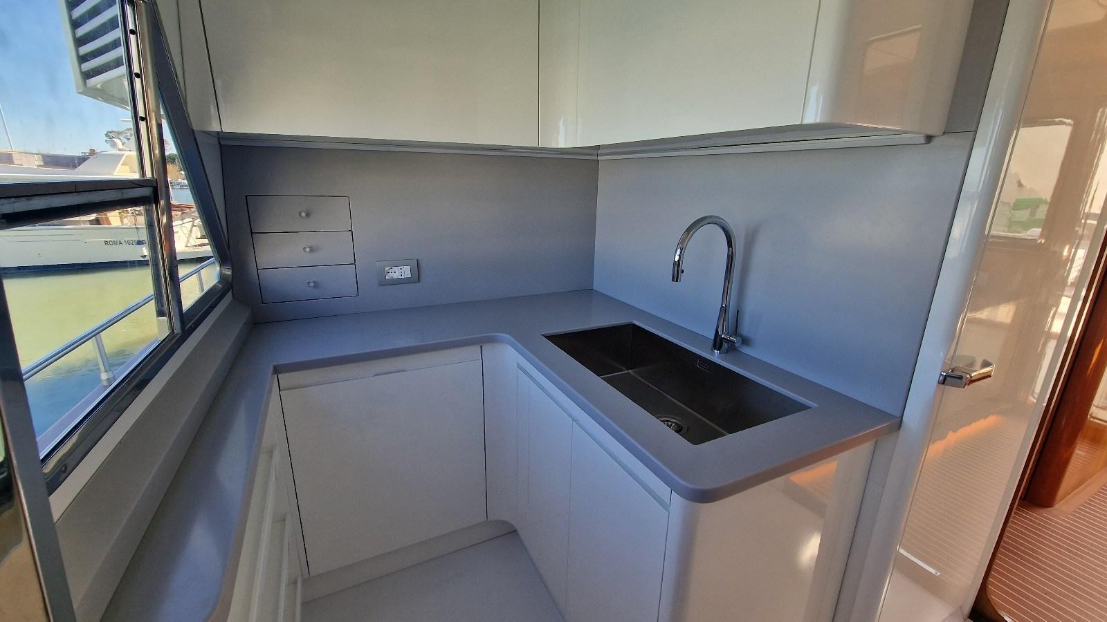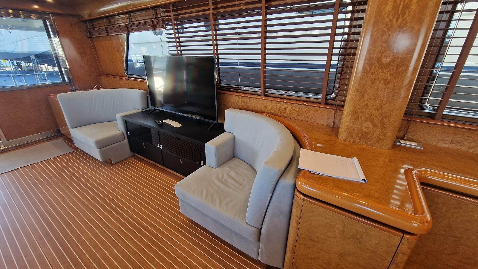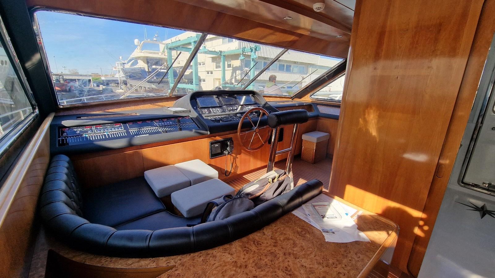 Alarme moteur, Alarme de pompe de cale, Eau sous pression, Système de vidange, Passavant en teck, Douche de cockpit, Double barre à roue, Phare de poursuite, Flaps hydrauliques, Grue de flybridge, Extincteur(s) fixe(s), Éclairage de courtoisie, Passerelle, Plateforme arrière, Porte latérale, Porte latérale, Cockpit en teck, Prise de quai, Connexion eau sous pression à quai, Rollbar, Guindeau électrique, Echelle de bain, Stabilisateurs, table de cockpit, Corne, Winch électrique arrière.