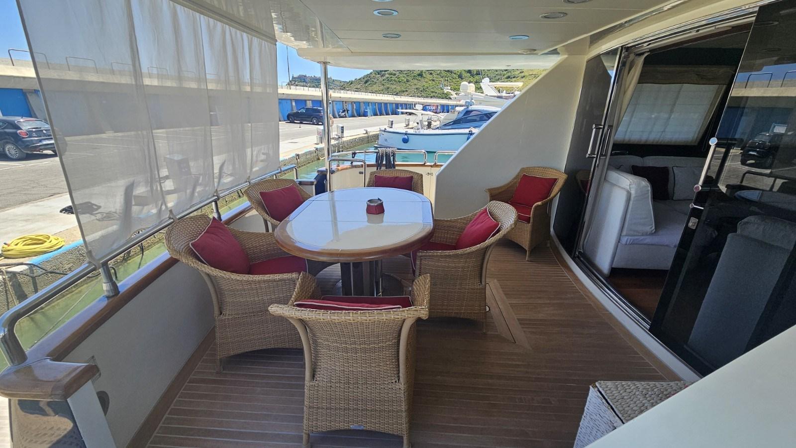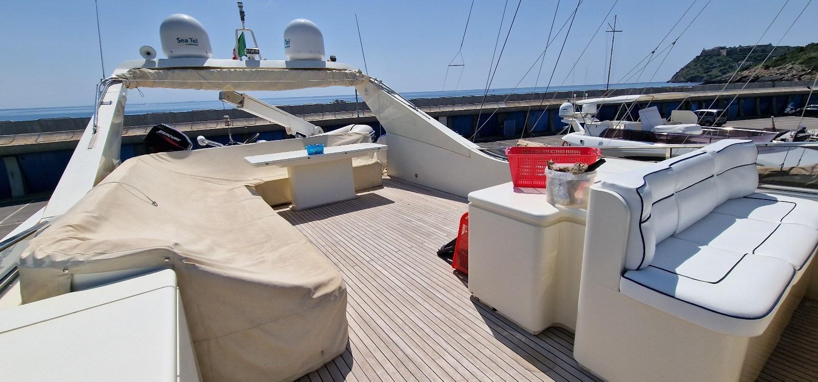 Alarme moteur, Alarme de pompe de cale, Eau sous pression, Système de vidange, Douche de cockpit, Double barre à roue, Flaps hydrauliques, Grue de flybridge, Extincteur(s) fixe(s), Éclairage de courtoisie, Passerelle, Plateforme arrière, Porte latérale, Porte latérale, Cockpit en teck, Prise de quai, Connexion eau sous pression à quai, Rollbar, Guindeau électrique, Echelle de bain, Selles pour Annexe, table de cockpit, Annexe, Corne, Winch électrique arrière.