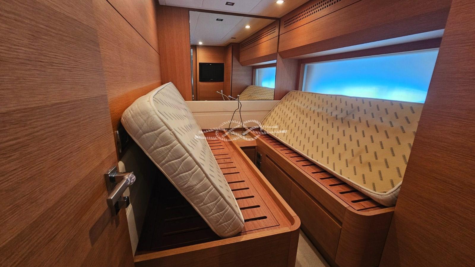 Cabine principale avec lit double, dressing et salle de bain - cabine vip avec lit double et salle de bain - cabine d’invités avec deux lits au sol - cabine d’invités avec deux lits au sol - salle de bain pour les invités.
