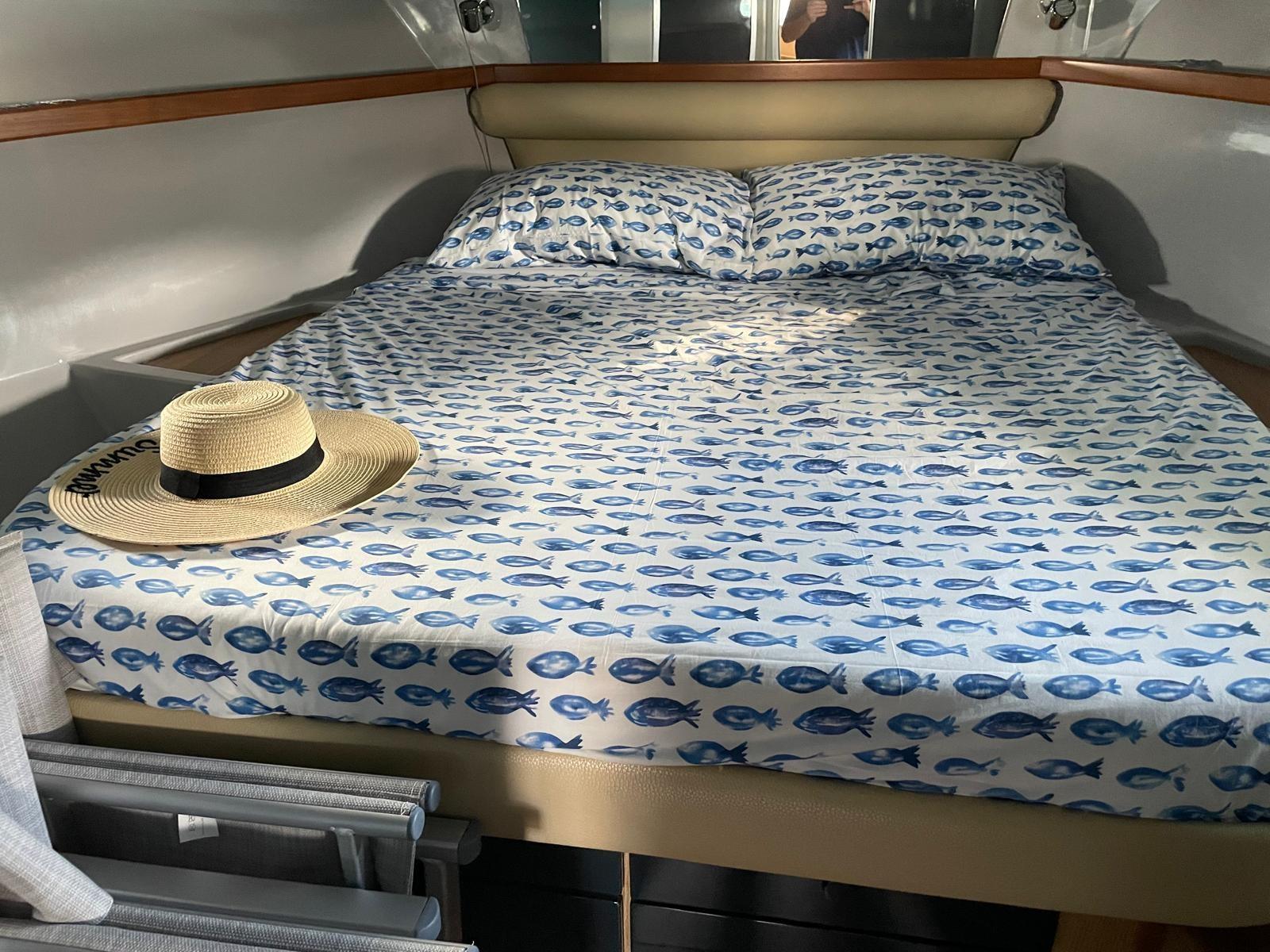 Cabine principale avec lit double et salle de bain - cabine d’invités avec deux lits plats et salle de bain - logement individuel de l’équipage avec équipements.