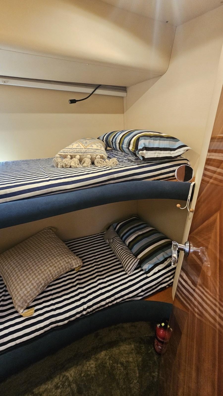 Cabine principale avec lit double et salle de bain - Cabine VIP avec lit double - Cabine d’invités avec deux lits au sol - Salle de bain invités.