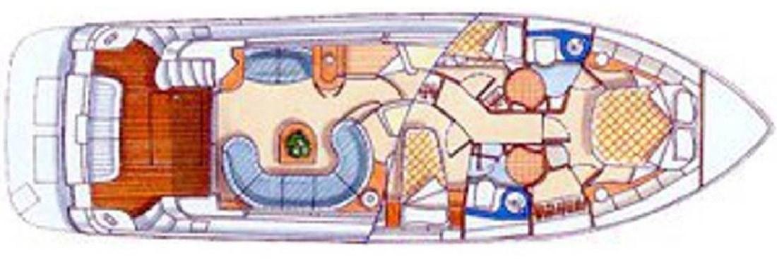 Alarme moteur, Eau sous pression, Système de vidange, Douche de cockpit, Double barre à roue, Flaps hydrauliques, Indicateurs de flaps, Spots sous-marins, Moteur hors-bord pour annexe, Passerelle, Plateforme arrière, Porte latérale, Cockpit en teck, Prise de quai, Rollbar, Guindeau électrique, Echelle de bain, table de cockpit, Annexe, Filières avec sortie latèrale, Corne, Winch électrique arrière.