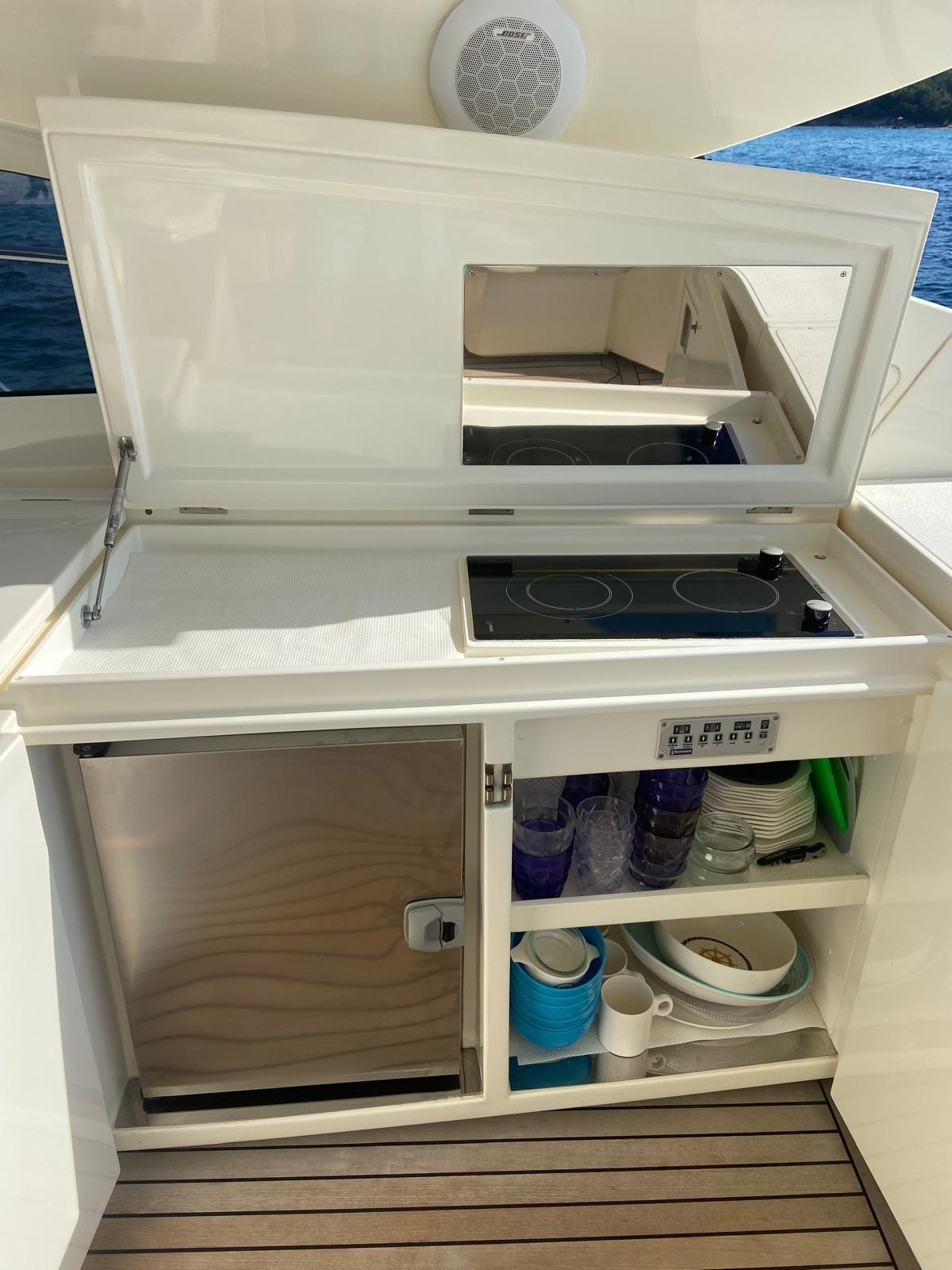 Propulseur d’étrave électrique - hard top rigide avec ouverture électrique - climatisation - Groupe électrogène Mase 12 kW - bar dans le cockpit avec réfrigérateur et plaque électrique deux brûleurs - antenne TV satellite - TV LCD - four micro-ondes combiné - plaque de cuisson électrique 4 feux - réfrigérateur - congélateur - passerelle électro-hydraulique escamotable.