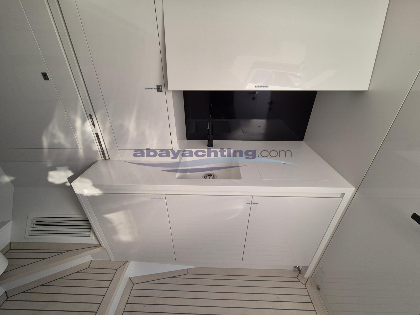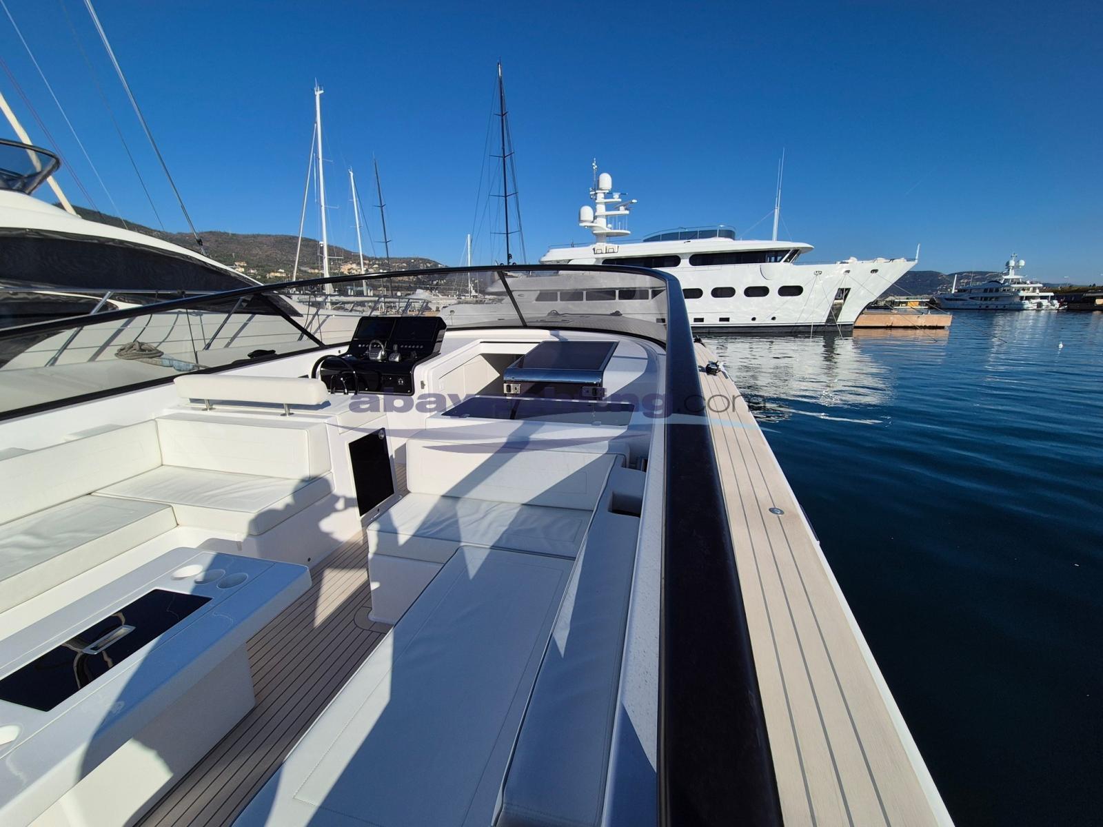 Alarme moteur, Alarme de pompe de cale, Ancre (+ CATENA), Eau sous pression, Passavant en teck (FLEXITEEK), Douche de cockpit, Propulseur de poupe (SIDEPOWER), Propulseur d'étrave (SIDEPOWER), Flaps hydrauliques, Extincteur(s) fixe(s), Indicateurs de flaps, Éclairage de courtoisie, Spots sous-marins, Plateforme arrière (IDRAULICA ABBATTIBILE), Pompe de cale automatique, Pompe de cale manuelle, Cockpit en teck (FLEXITEEK), Prise de quai, Guindeau électrique, Echelle de bain, table de cockpit (REFRIGERATO).