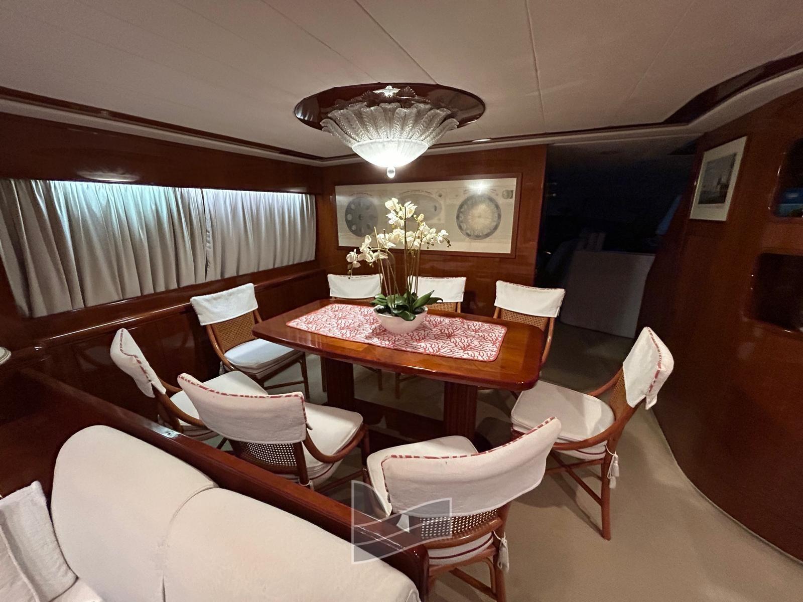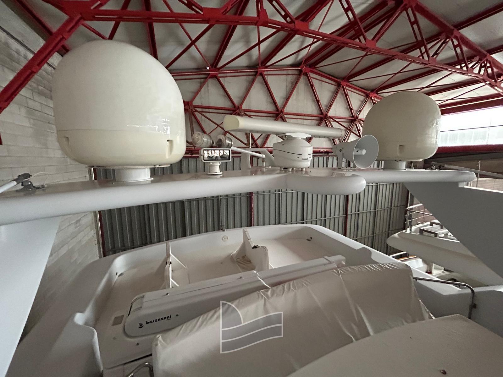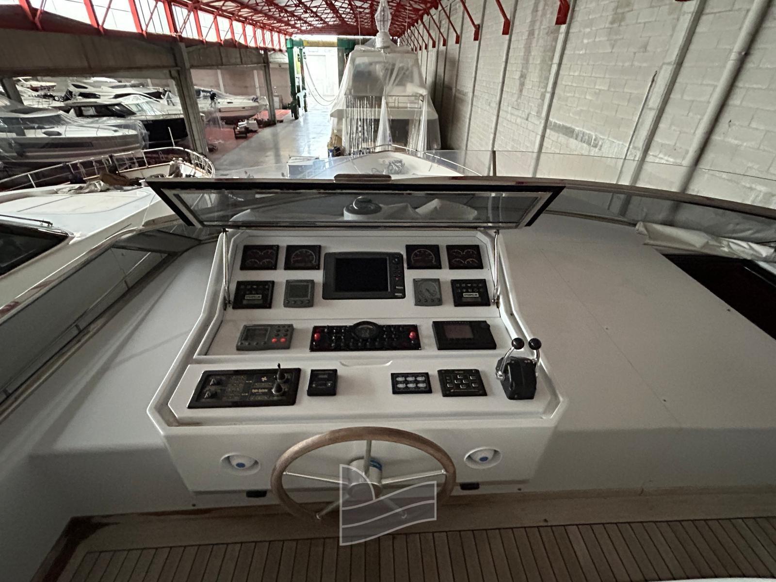 Alarme moteur, Eau sous pression, Passavant en teck, Douche de cockpit, Phare de poursuite, 2 Flaps hydrauliques, Extincteur(s) fixe(s), Lavage de chaine, Passerelle (idraulica a scomparsa), Plateforme arrière (di poppa in teak), Pompe de cale automatique, Pont en teck, Porte latérale, Cockpit en teck, Prise de quai, Onduleur, Guindeau électrique, Echelle de coupée, Echelle de bain, table de cockpit, Corne, Winch électrique arrière, Winch électrique avant.