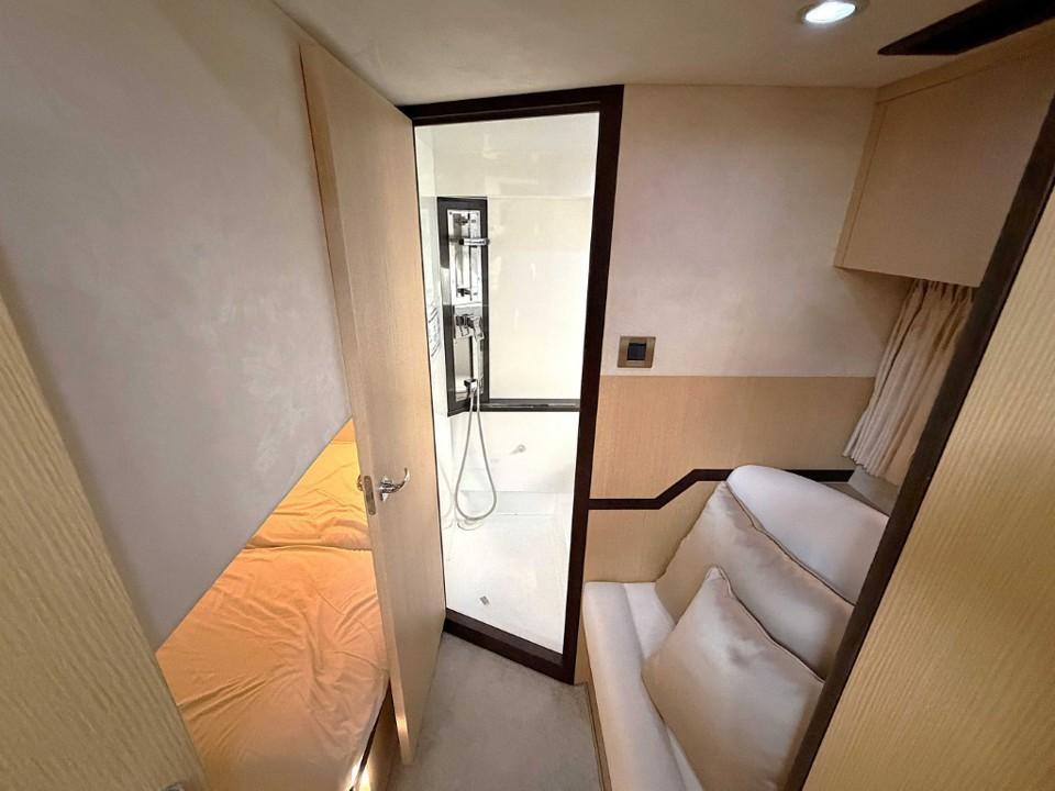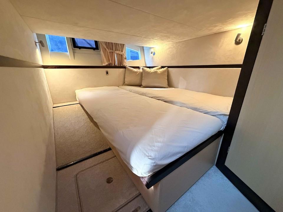 L’agencement comprend un salon climatisé, une cabine propriétaire full beam avec toit panoramique, ainsi qu’une seconde cabine double avec salle d’eau.