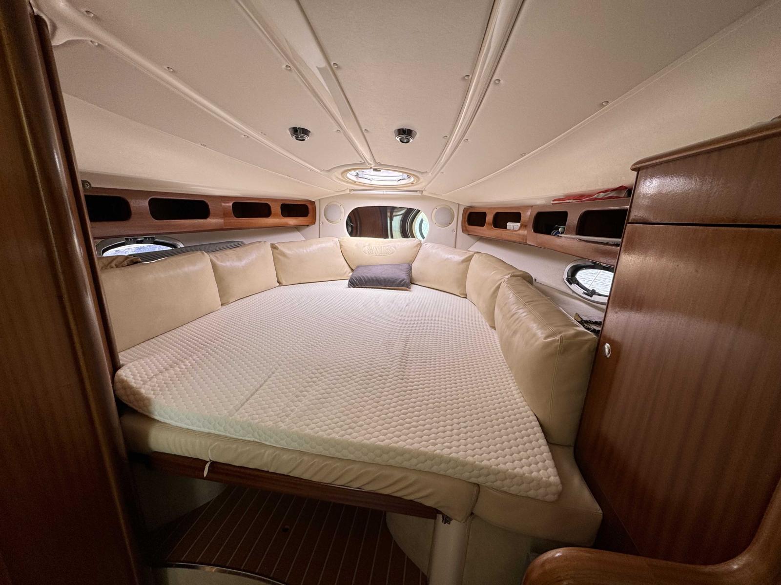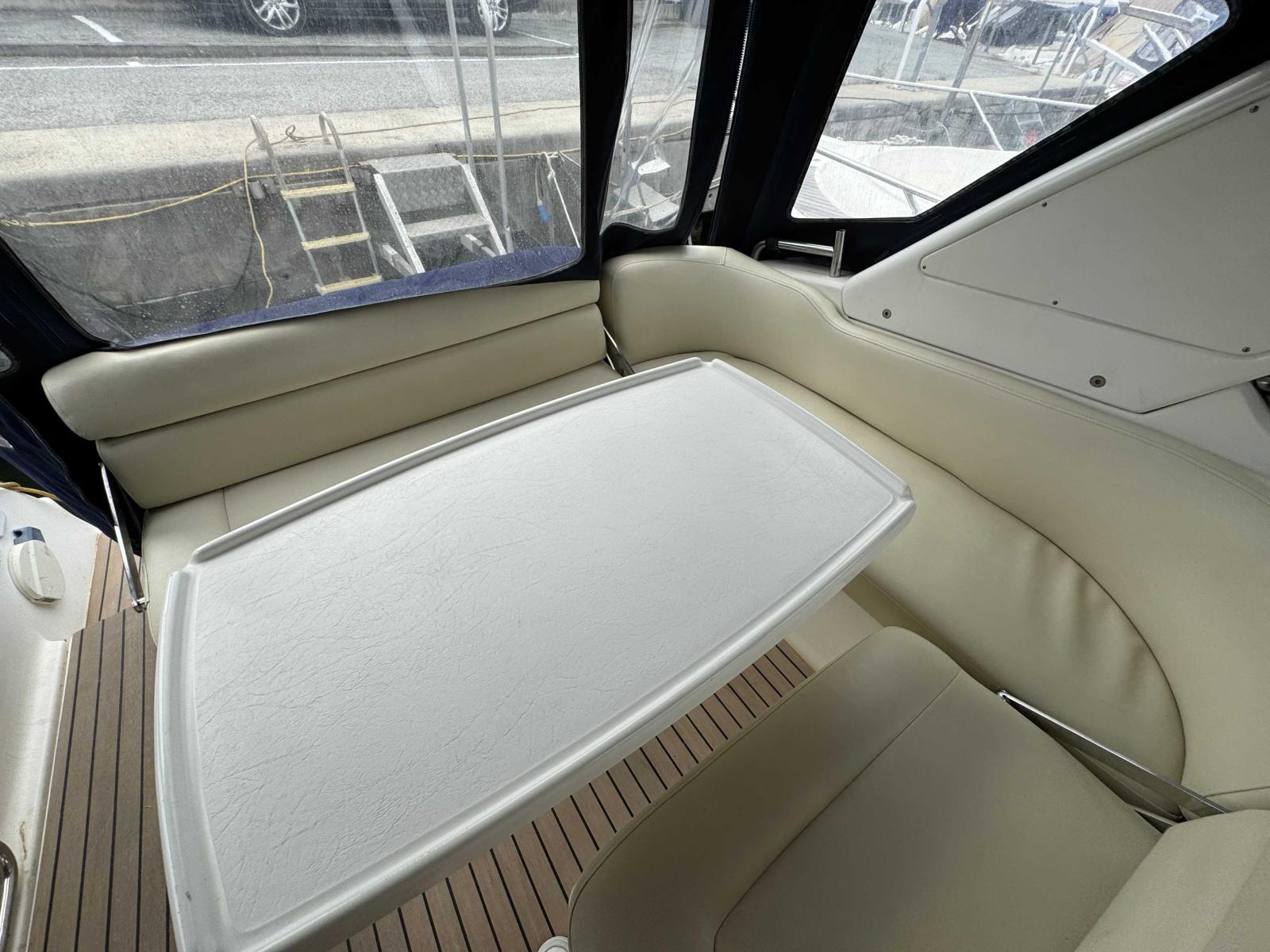 Aménagements intérieurs : Sous le pont, le Bavaria Sport 29 propose un espace de vie bien agencé avec un salon convertible (matelas à mémoire de forme sur mesure) + une cabine fermée à l'arrière, 4 couchages.