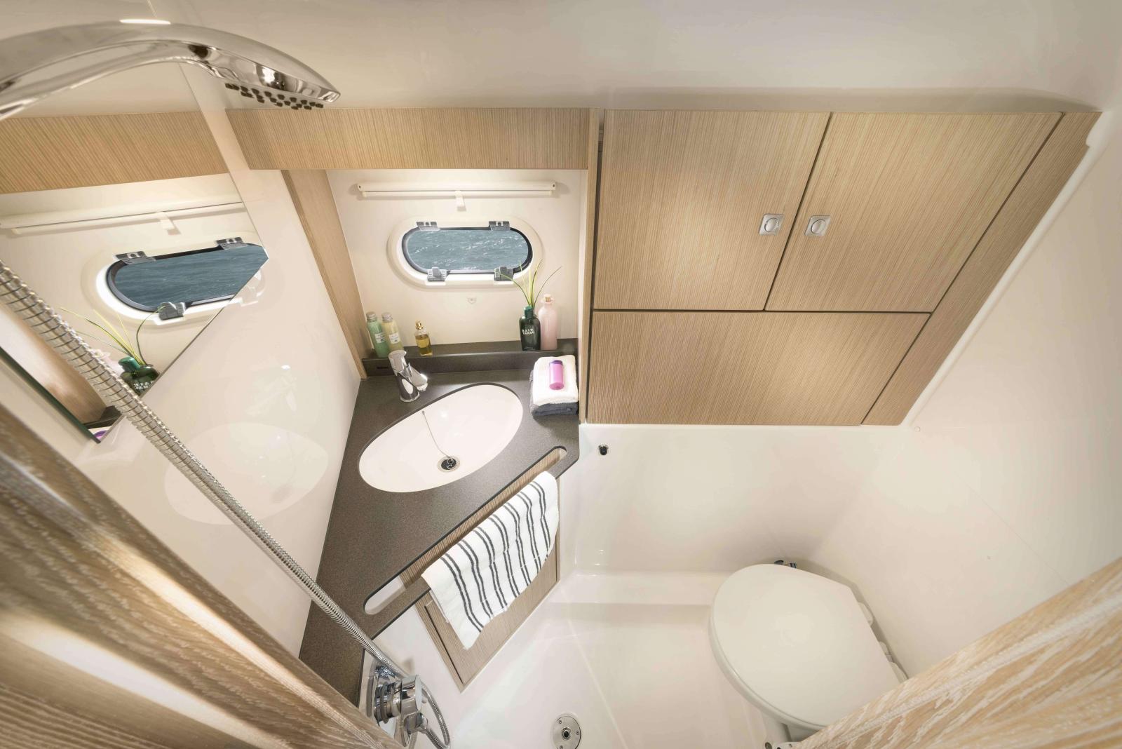 - Cabines :Il y a une cabine principale avec un lit double, et une zone dinette convertible dans le salon, qui peut se transformer en zone de couchage supplémentaire.