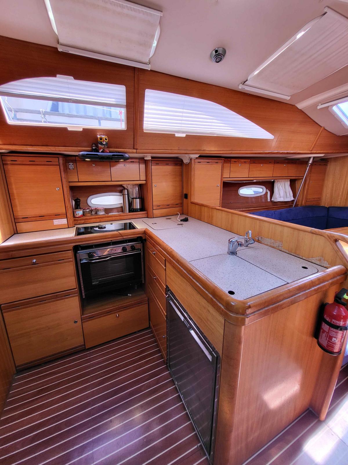 La cuisine est bien équipée avec un réfrigérateur, une cuisinière, un four et de nombreux espaces de rangement, ce qui permet de préparer facilement des repas en mer.