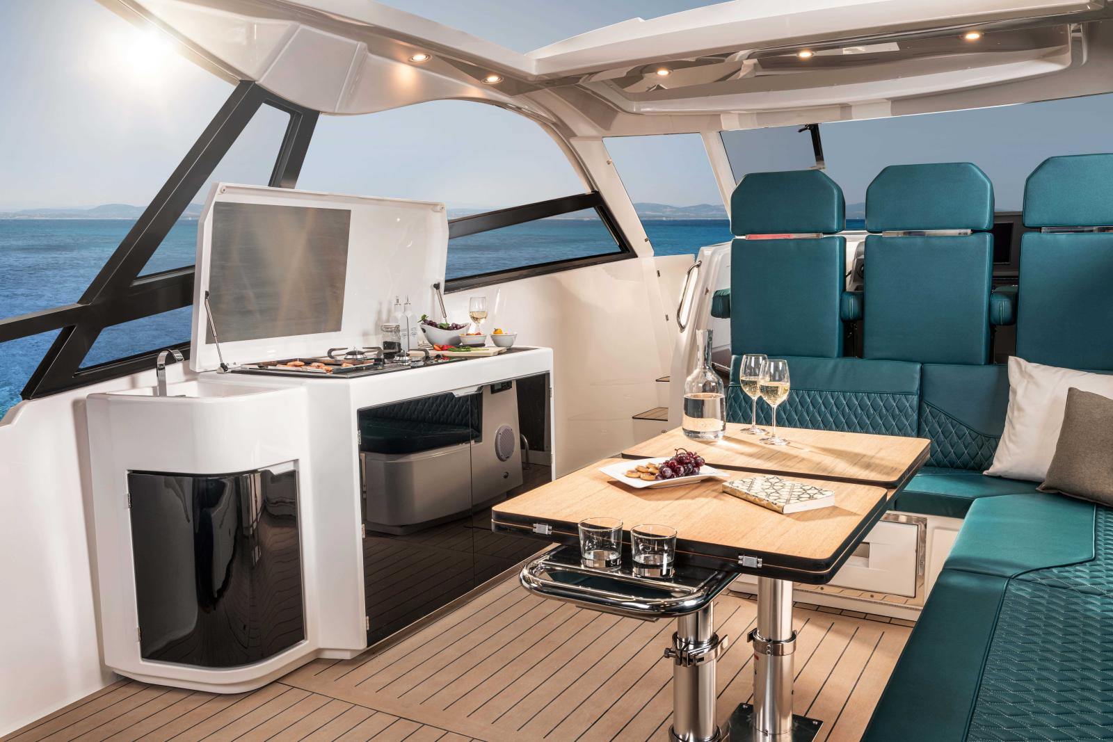 Cockpit :Le cockpit est conçu pour offrir un espace de divertissement en plein air, avec des sièges rembourrés, une table et souvent un poste de pilotage bien équipé pour le capitaine.