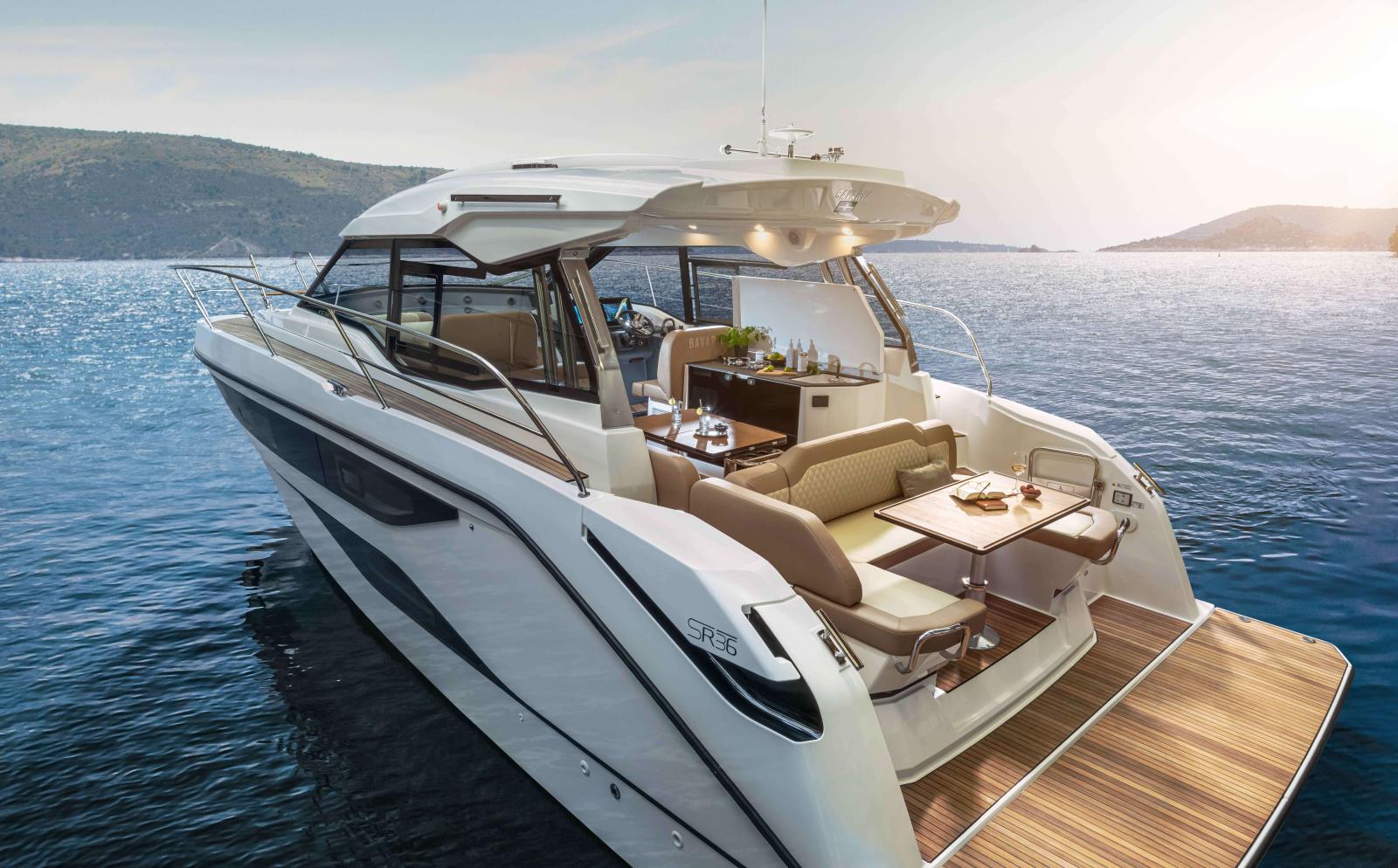 Sur les traces de son aîné, le Bavaria SR 41, le SR 38 est entièrement novateur grâce à son concept unique de semi-open. En effet, le toit de sa structure est conservé et combiné à un pare-brise bas qui n'est pas totalement fermé. Vous apprécierez la luminosité traversante qui envahi ce yacht de luxe qui n'a rien à envier des grands. En ouvrant l'espace de toutes parts, le Bavaria SR38, créer de l'espace et repousse les limites. Vous avez le choix d'ouvrir ou de fermer complètement le cockpit pour créer une pièce à l'extérieur afin de recevoir vos convives par tout temps. A l'extérieur, vous serez séduit par sa grande plateforme de bain qui accueillera aisément une petite annexe lors de vos sorties en mer.