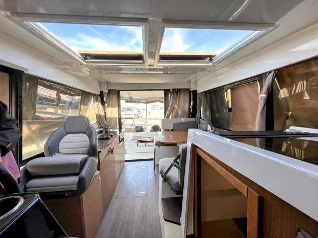Les performances et la fiabilité sont au rendez-vous avec une navigation stable, un comportement en mer exceptionnel et un pilotage aisé. Des pointes à 37 nœuds pour les amateurs de sensations, et une manœuvrabilité forte également à petite vitesse. La polyvalence, la richesse des équipements et l’ingéniosité de l’aménagement, qui ont fait le succès de la gamme, se retrouvent sur ce grand modèle, avec naturellement des volumes remarquables et un confort à bord encore amélioré.