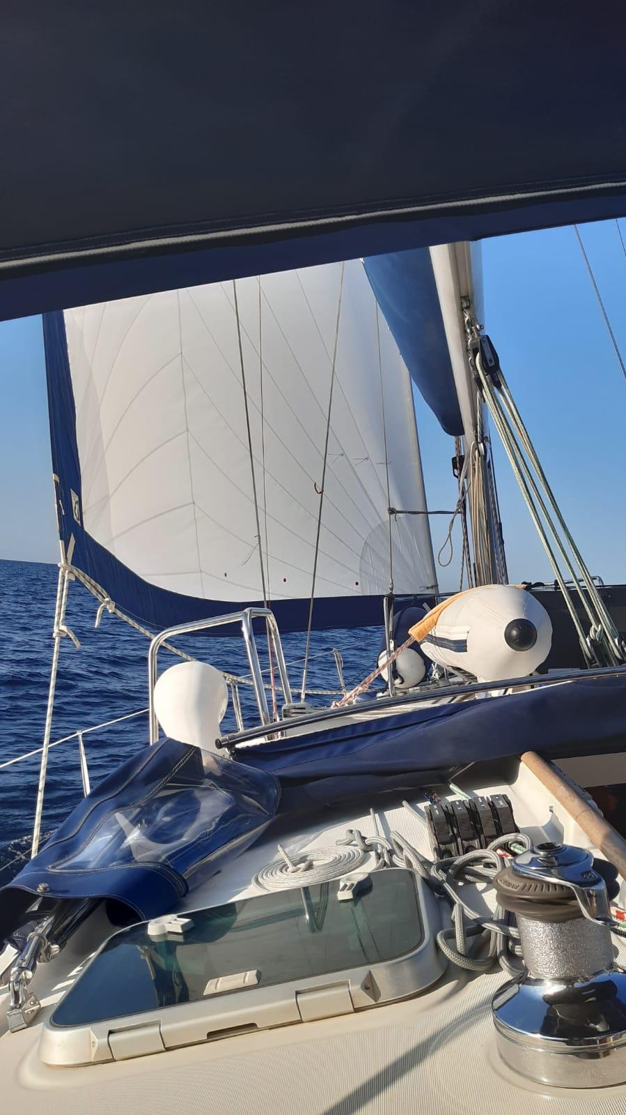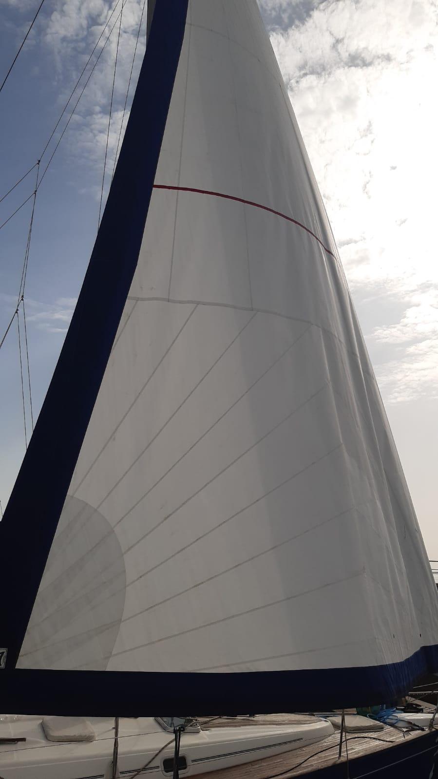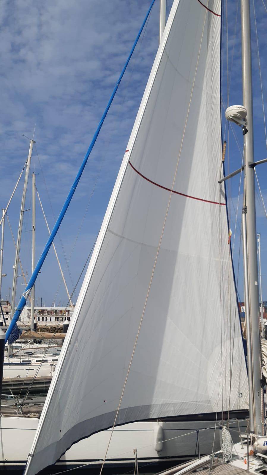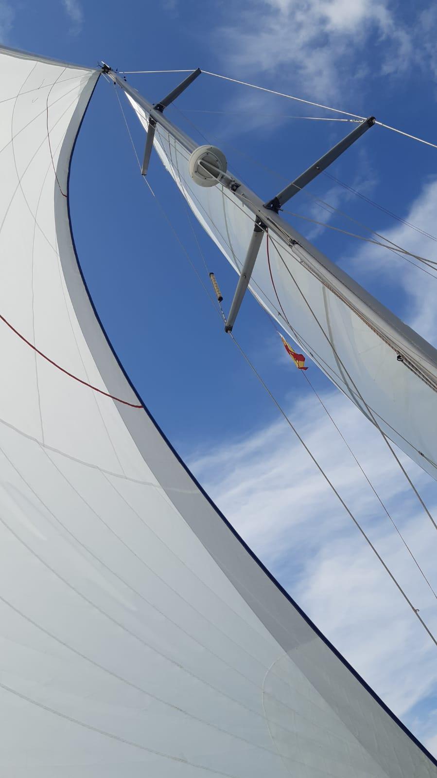 - GRAND-VOILE : 44 m2 Fullbatten, à chariots. Lattée 3 ris coupe « cross cut », voile Dacron haute ténacité 440g/m2, assemblage couture 6 temps fil anti-UV, lattes jonc montée sur boîtier SDA (sur chute et guindant)