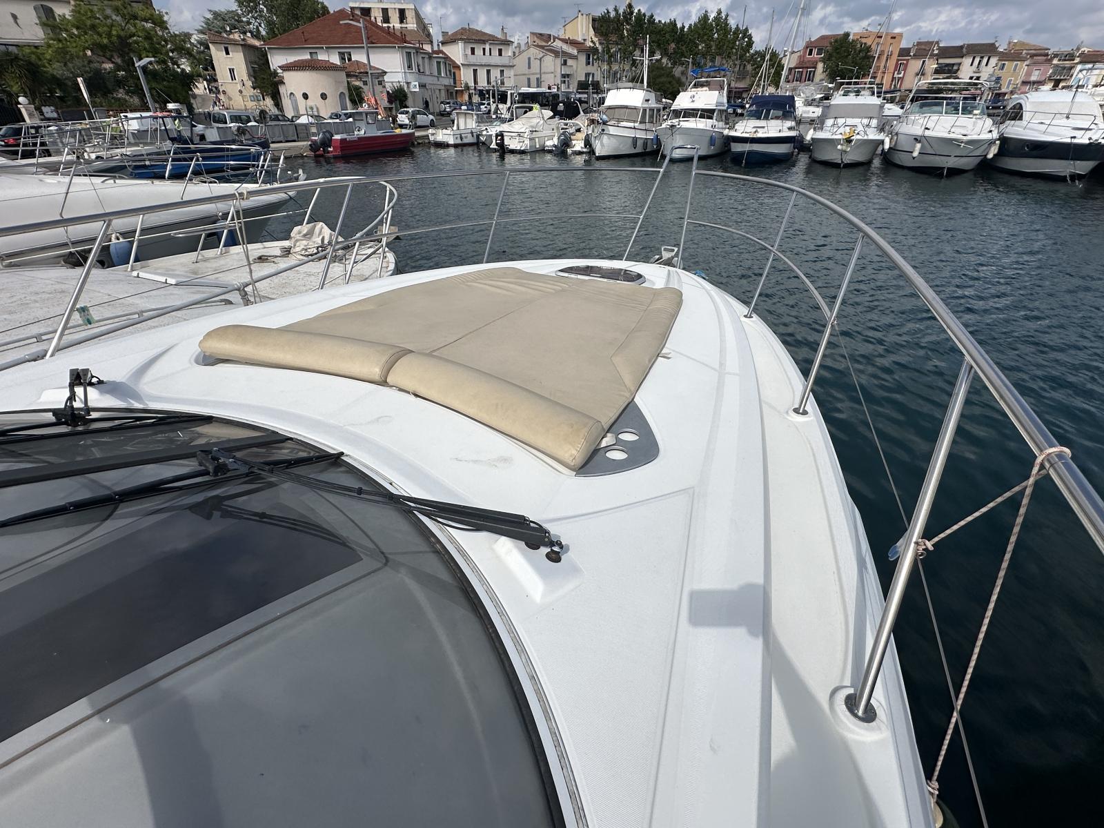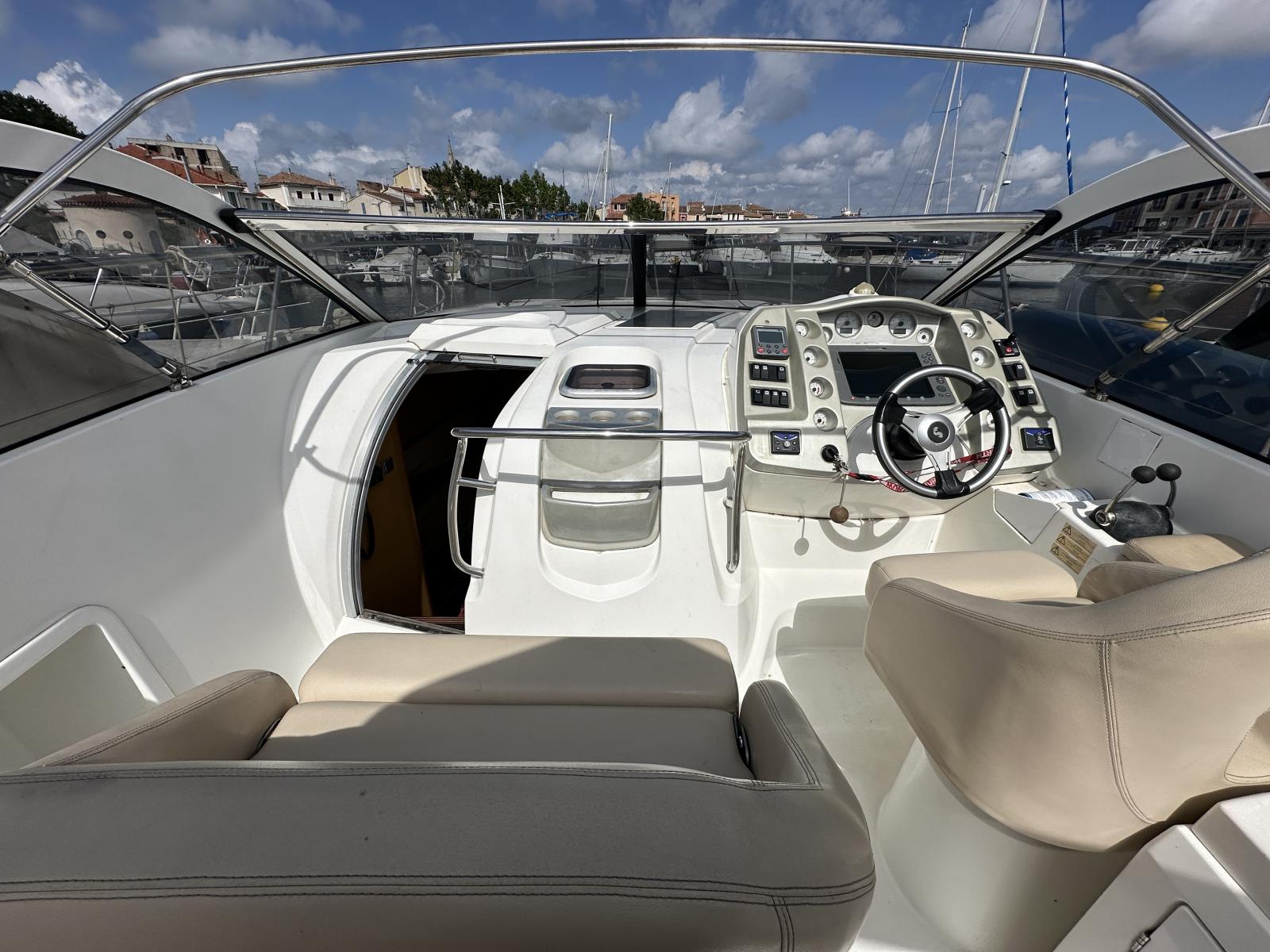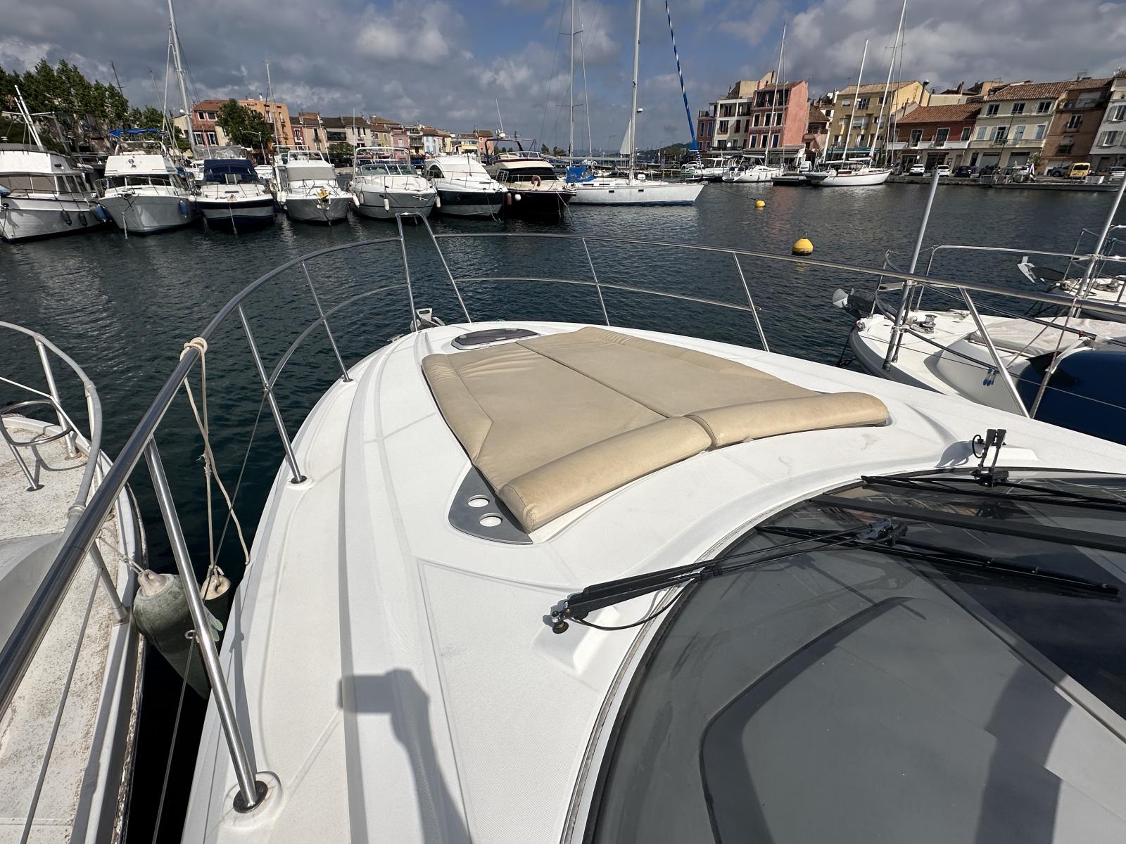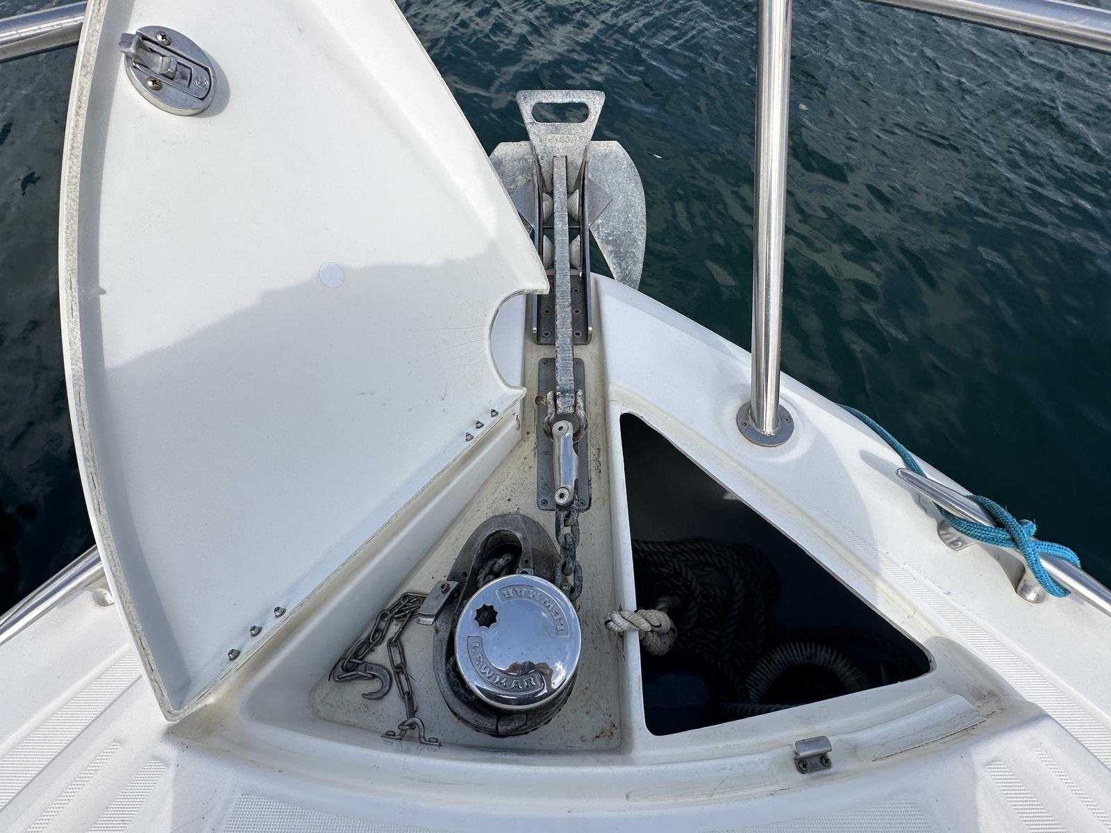 Équipé avec Pack raymarine Gps sondeur traceur E120, pilote automatique, Vhf navicom, hifi fusion MSRA70, propulseur d’étrave, 2 réfrigérateurs, chauffe eau, salle de bain avec wc et douche, deux cabines, 6 couchages au total, salon, cuisine, 2 feu gaz, cuisine extérieure avec évier et plancha électrique, carré transformable extérieur, bains de soleil avant et arrière, plateforme de bain en teck, passerelle hydraulique, Bimini et taud de camping (non visibles sur les photos).