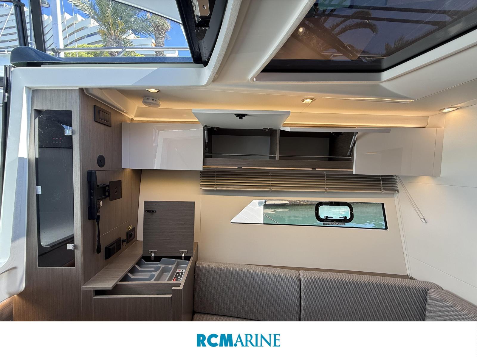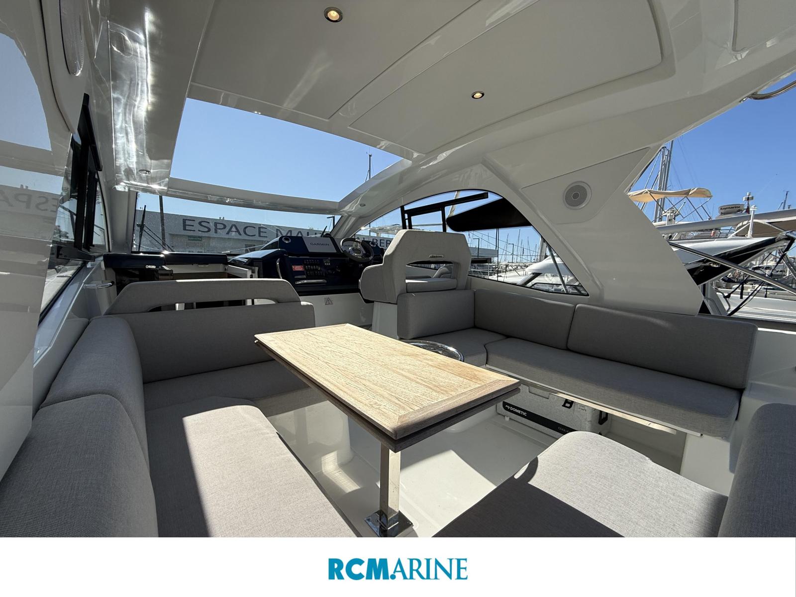 Le hard-top profilé du Gran Turismo 36 donne le ton d’un express-cruiser sportif et élégant. Sur une carène équipée de zipwakes pour la stabilité des virages, le plan de pont propose des espaces dédiés à chaque moment de vie à bord. Le large bain de soleil encastré à la pointe avant crée un espace inédit. Avec son hard-top agrémenté d’un toit ouvrant, l’arrière du bateau combine protection et ouverture. Le spacieux salon de cockpit réunit autour de la table jusqu’à 8 convives. A l’arrière, un large bain de soleil regarde la mer avec, en vis à vis, la cuisine extérieure. Au poste de navigation, deux banquettes-double face à la mer permettent à 4 personnes de partager les sensations du pilote.