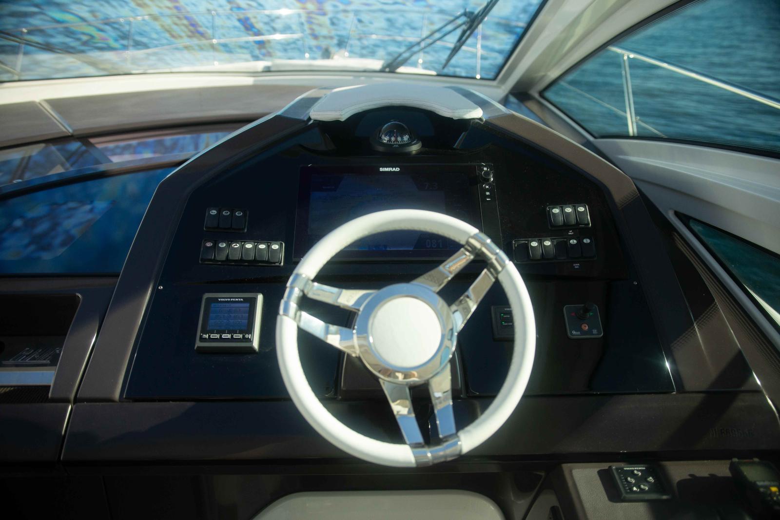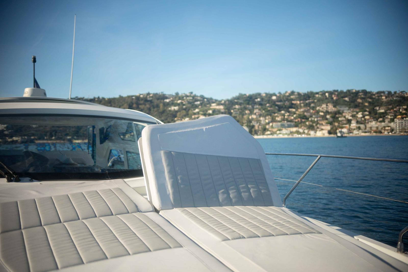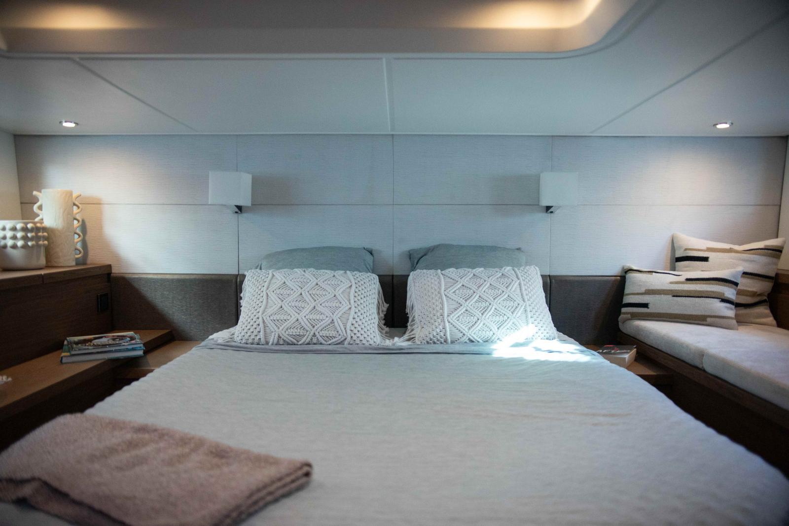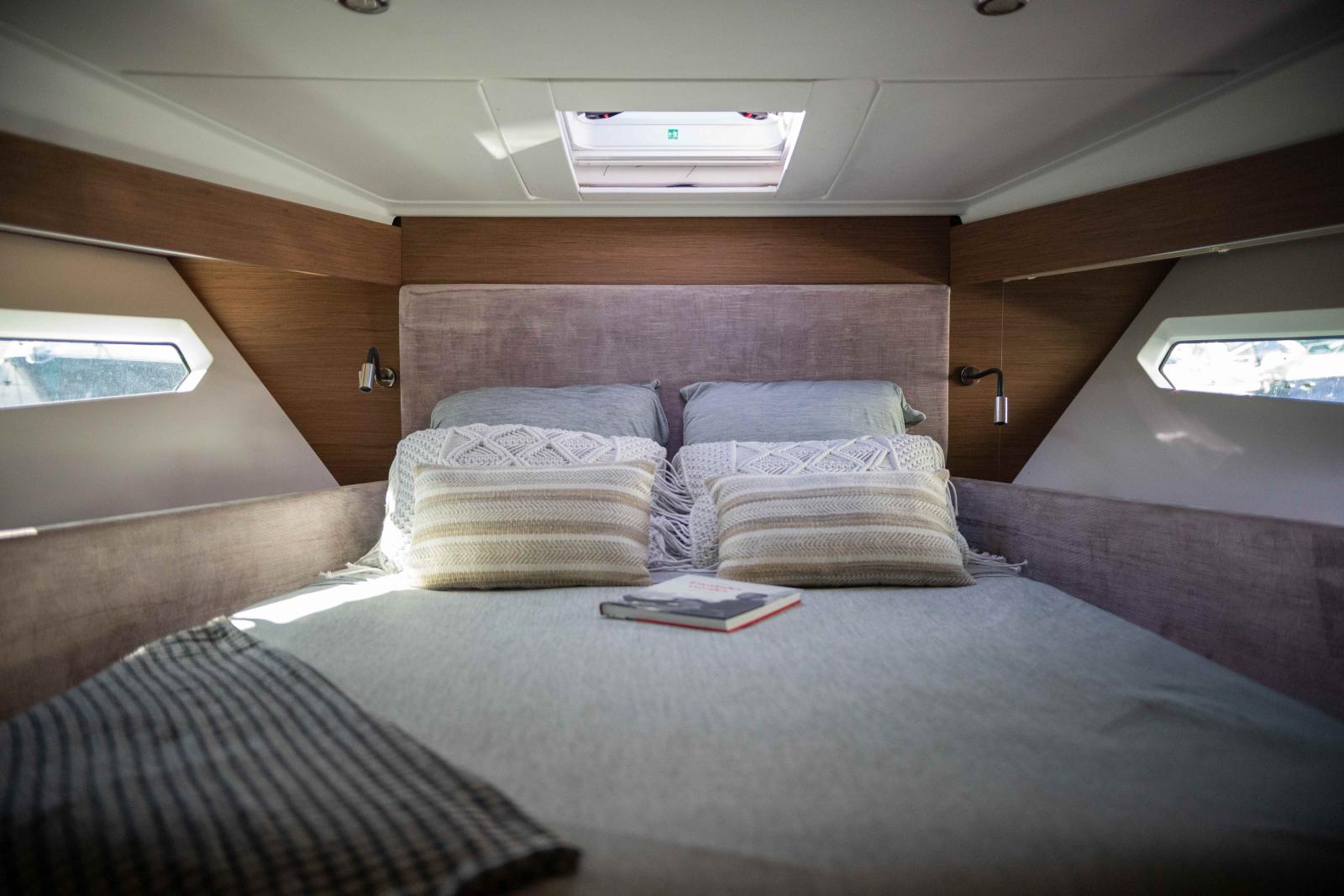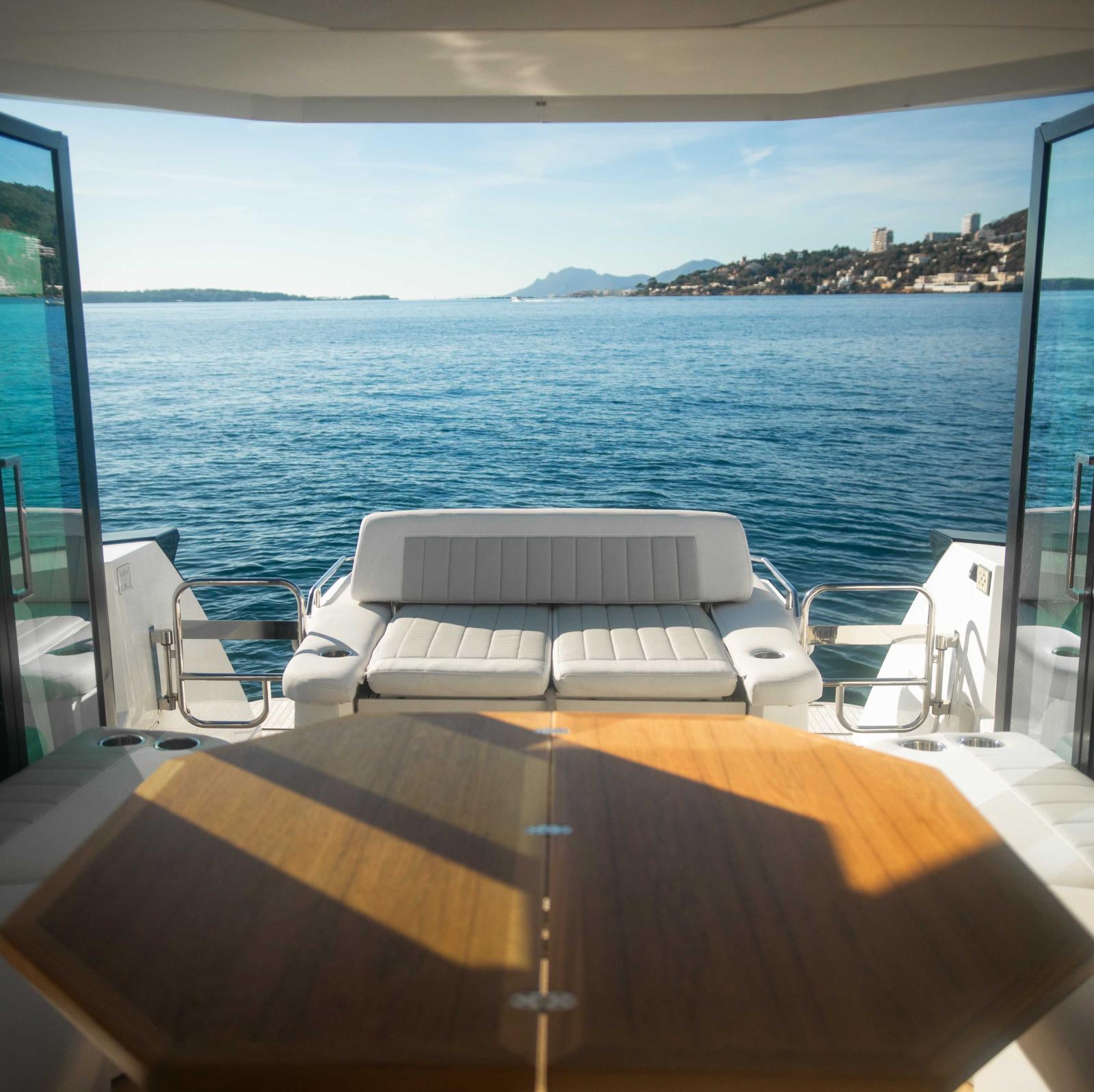 A la fois protecteur et ouvert, le cockpit ultra-spacieux possède des vitrages latéraux électriques et il est possible d’opter pour une porte vitrée elle aussi totalement ouvrante. Avec une suite propriétaire double-vue sur mer s’étirant sur toute la largeur du bateau et une cabine VIP également dotée d’une salle d’eau avec douche séparée, le Gran Turismo 46 offre une qualité d’accueil exceptionnelle sur cette taille de vedette.