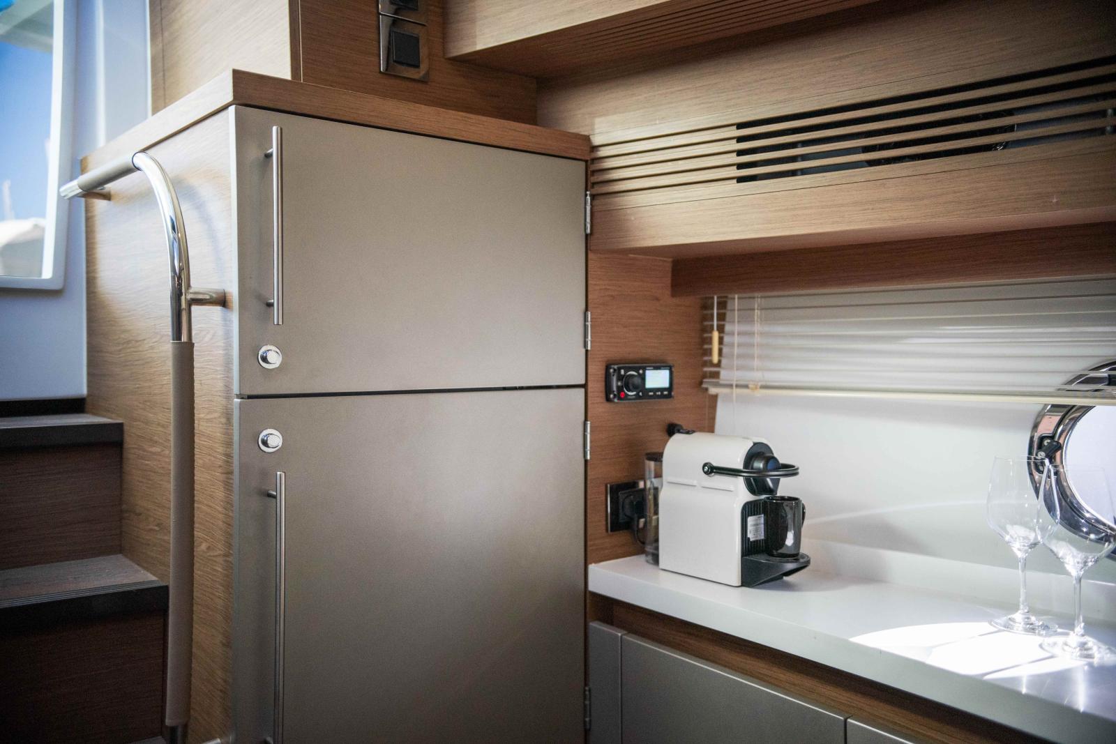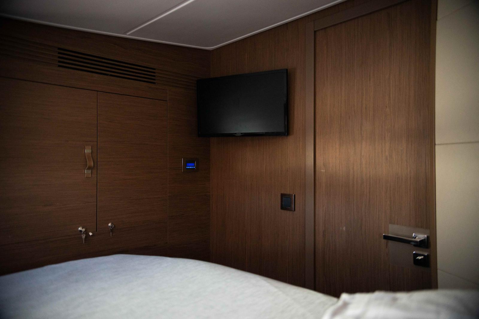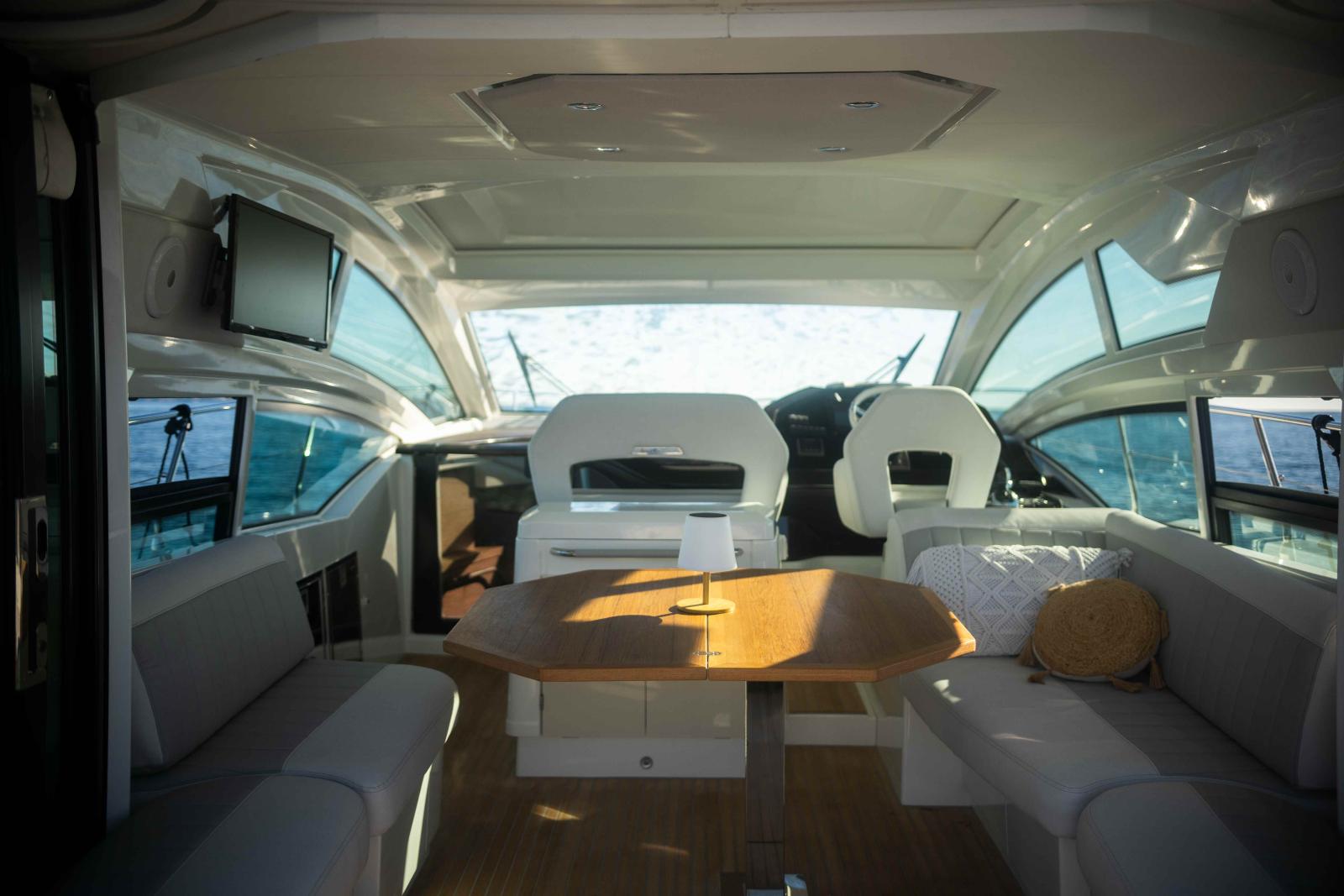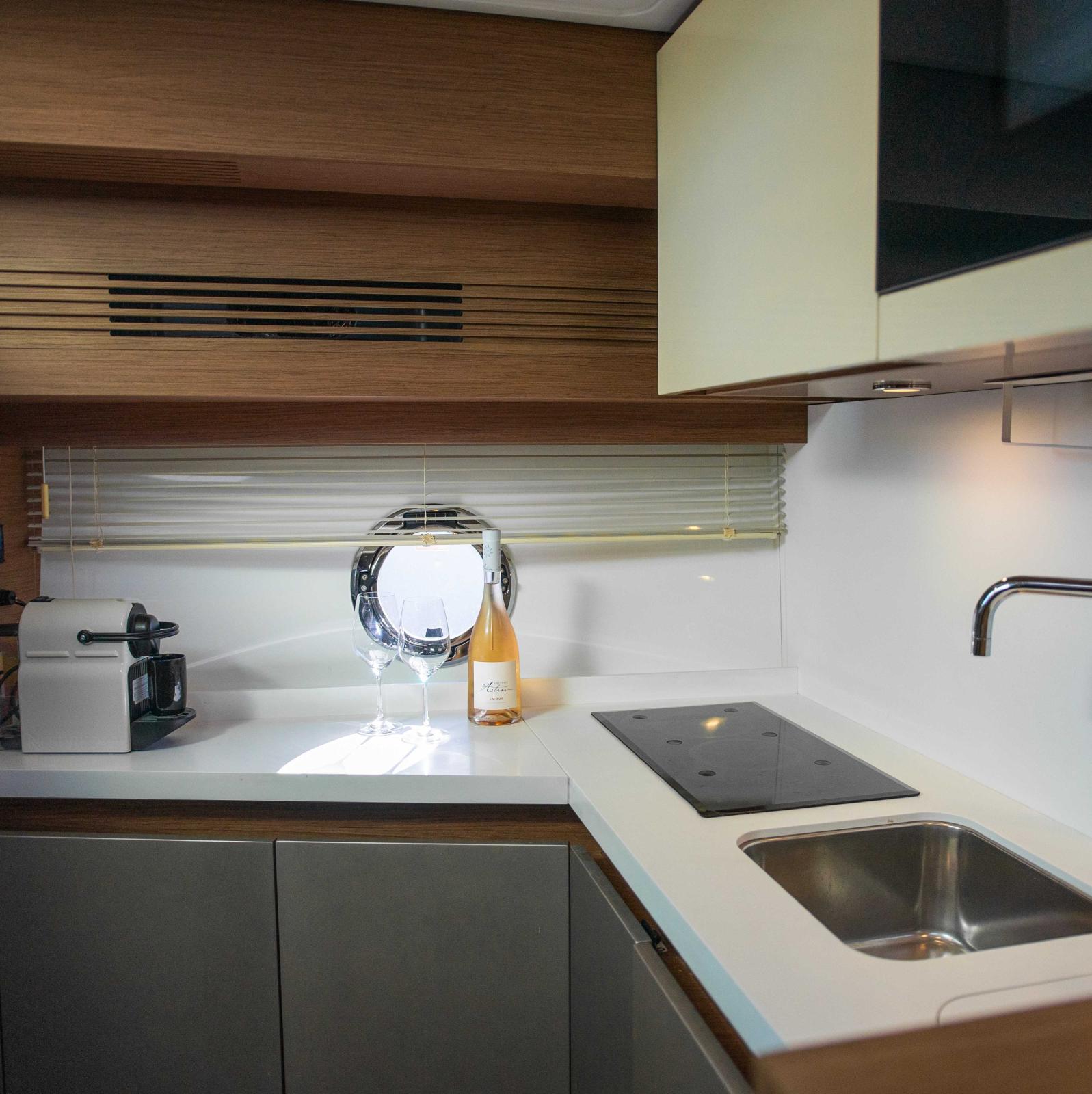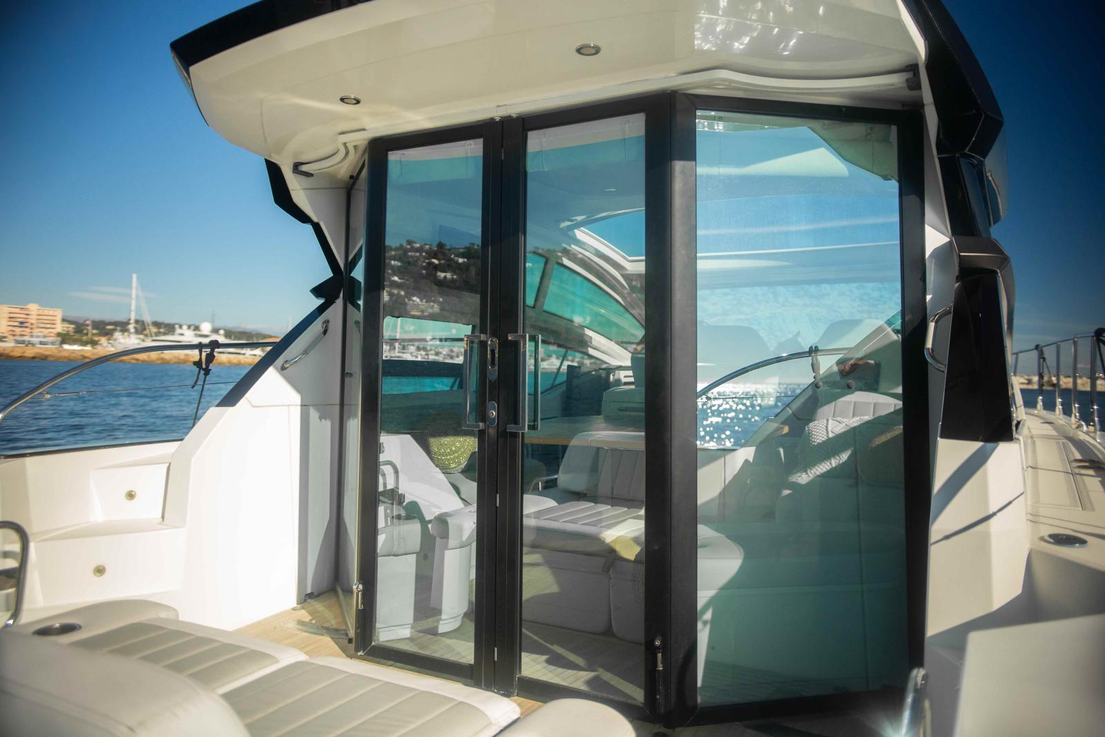 A la fois protecteur et ouvert, le cockpit ultra-spacieux possède des vitrages latéraux électriques et il est possible d’opter pour une porte vitrée elle aussi totalement ouvrante. Avec une suite propriétaire double-vue sur mer s’étirant sur toute la largeur du bateau et une cabine VIP également dotée d’une salle d’eau avec douche séparée, le Gran Turismo 46 offre une qualité d’accueil exceptionnelle sur cette taille de vedette.