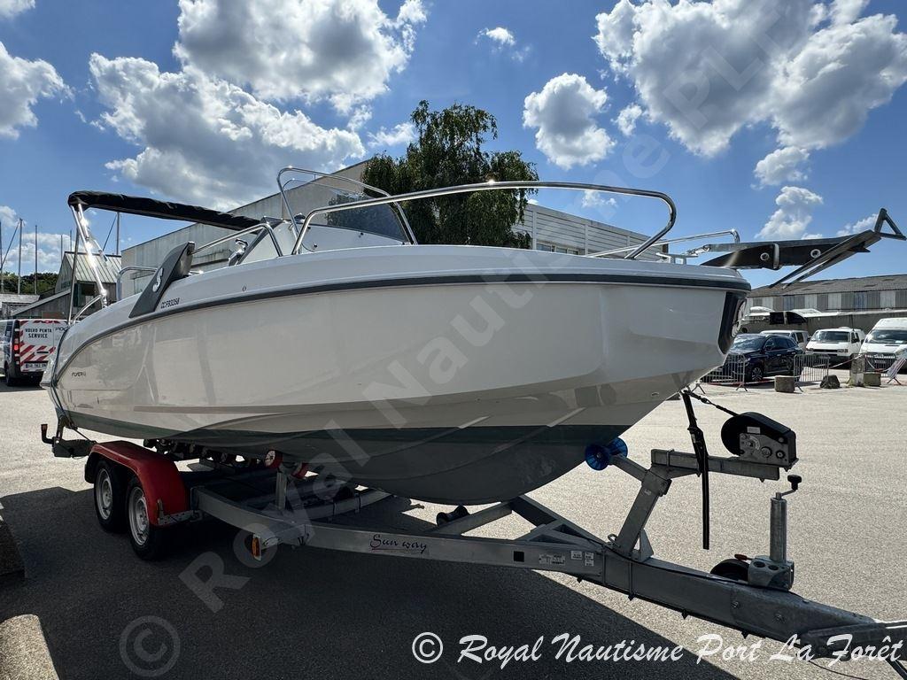 Perfectly equipped, it features a Garmin GPS/sounder, a deck shower, a forward sun deck, upholstery in excellent condition, as well as a console cover and a bimini top. The extended swim platforms facilitate access to the sea.