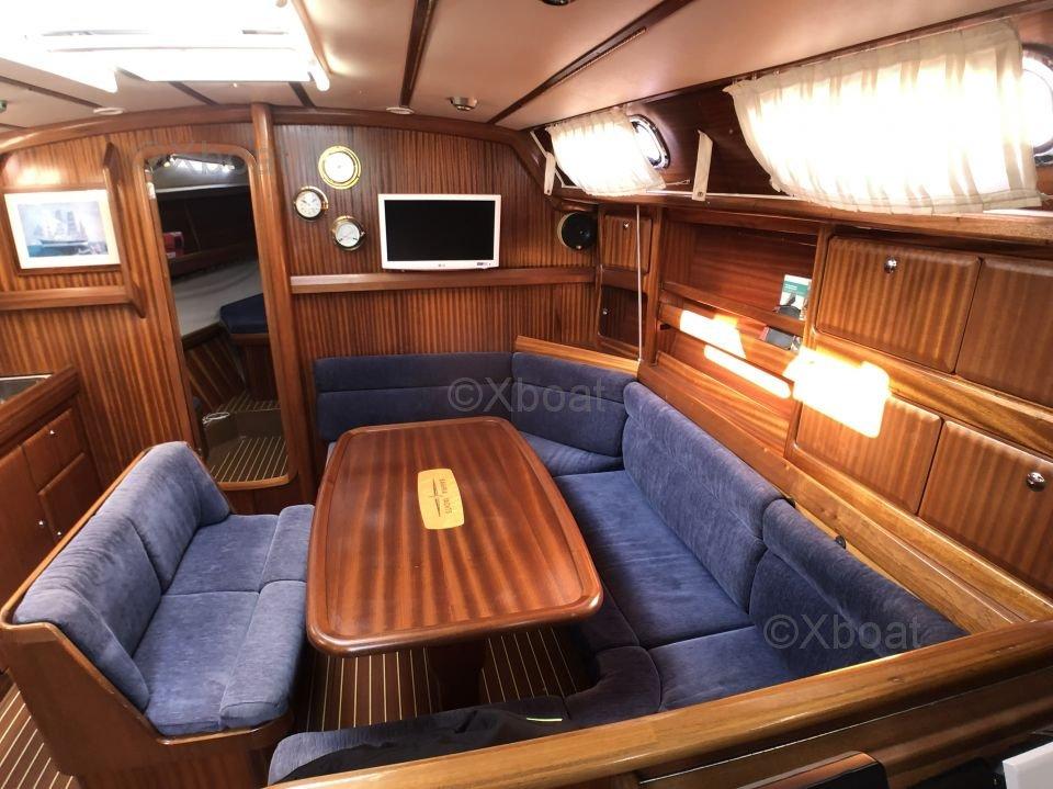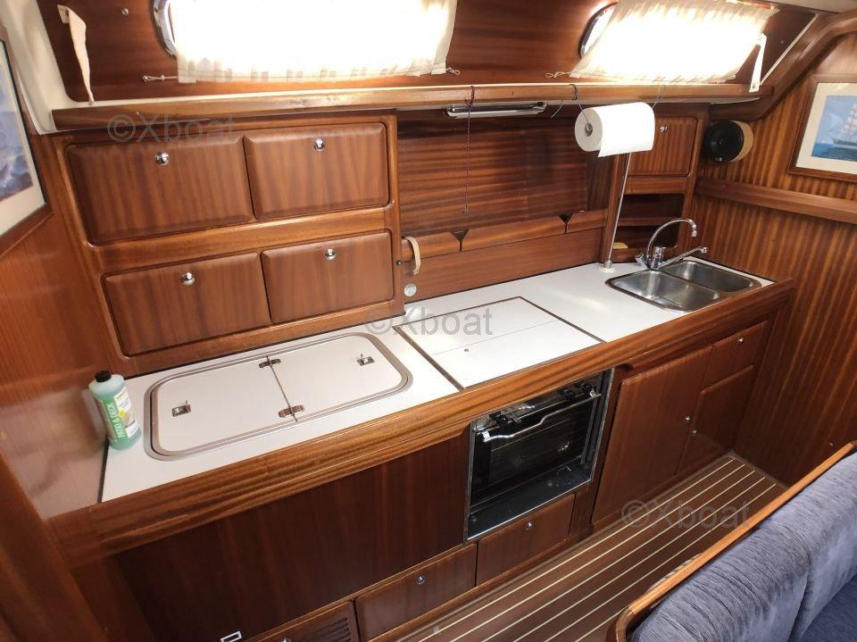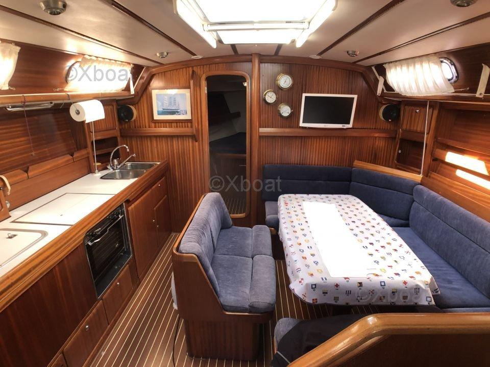 L'intérieur du Bavaria 42 est spacieux et lumineux, grâce à ses nombreux hublots et à son aménagement en bois clair. Le salon offre une hauteur sous barrots généreuse, ce qui permet de se déplacer confortablement. Les cabines sont également spacieuses et bien ventilées, offrant un espace de repos agréable. La cuisine est bien équipée et fonctionnelle, idéale pour préparer des repas en mer.