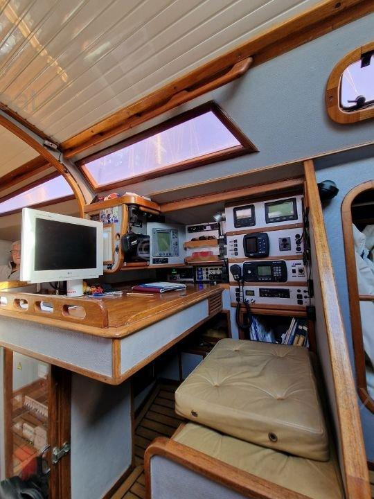 L'intérieur est composé d'un carré central avec une table repliable et une grande table à carte reprenant l'électronique (ordinateur avec cartes marines numérisées, radar, VHF, B.L.U, sondeurs et divers instruments de navigation).