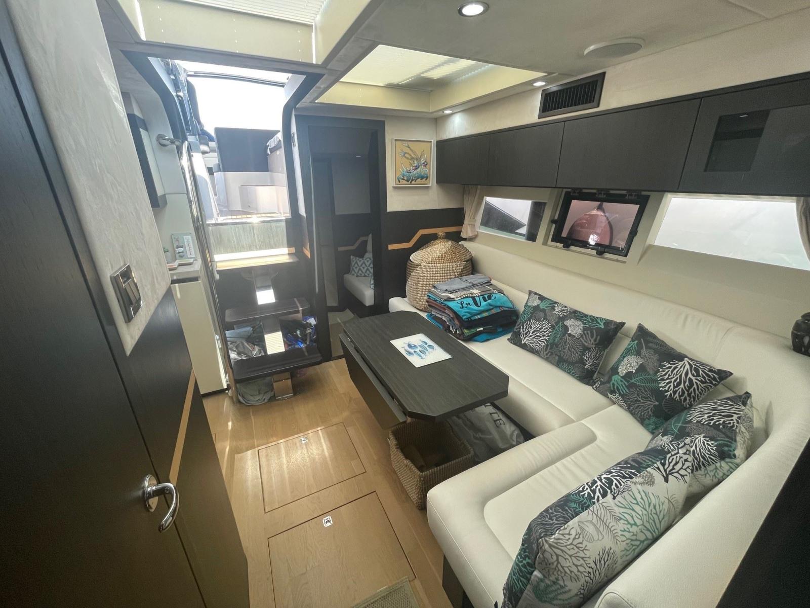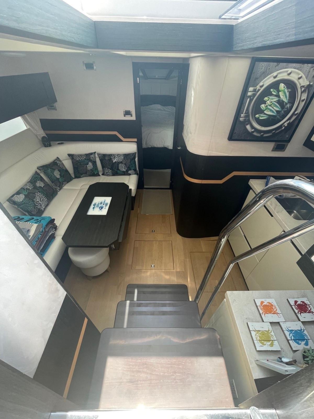 À l'intérieur, le Galeon 405 HTL propose un espace de vie spacieux et lumineux, grâce à de grandes fenêtres panoramiques qui permettent une vue imprenable sur la mer et laissent entrer une abondance de lumière naturelle. Le salon principal est aménagé avec des matériaux de haute qualité et des finitions luxueuses, créant une atmosphère chaleureuse et accueillante. Le cockpit ouvert se prolonge harmonieusement vers la mer, offrant un espace idéal pour se détendre et profiter du soleil, tandis que le toit ouvrant électrique permet de créer une connexion fluide entre l'intérieur et l'extérieur.