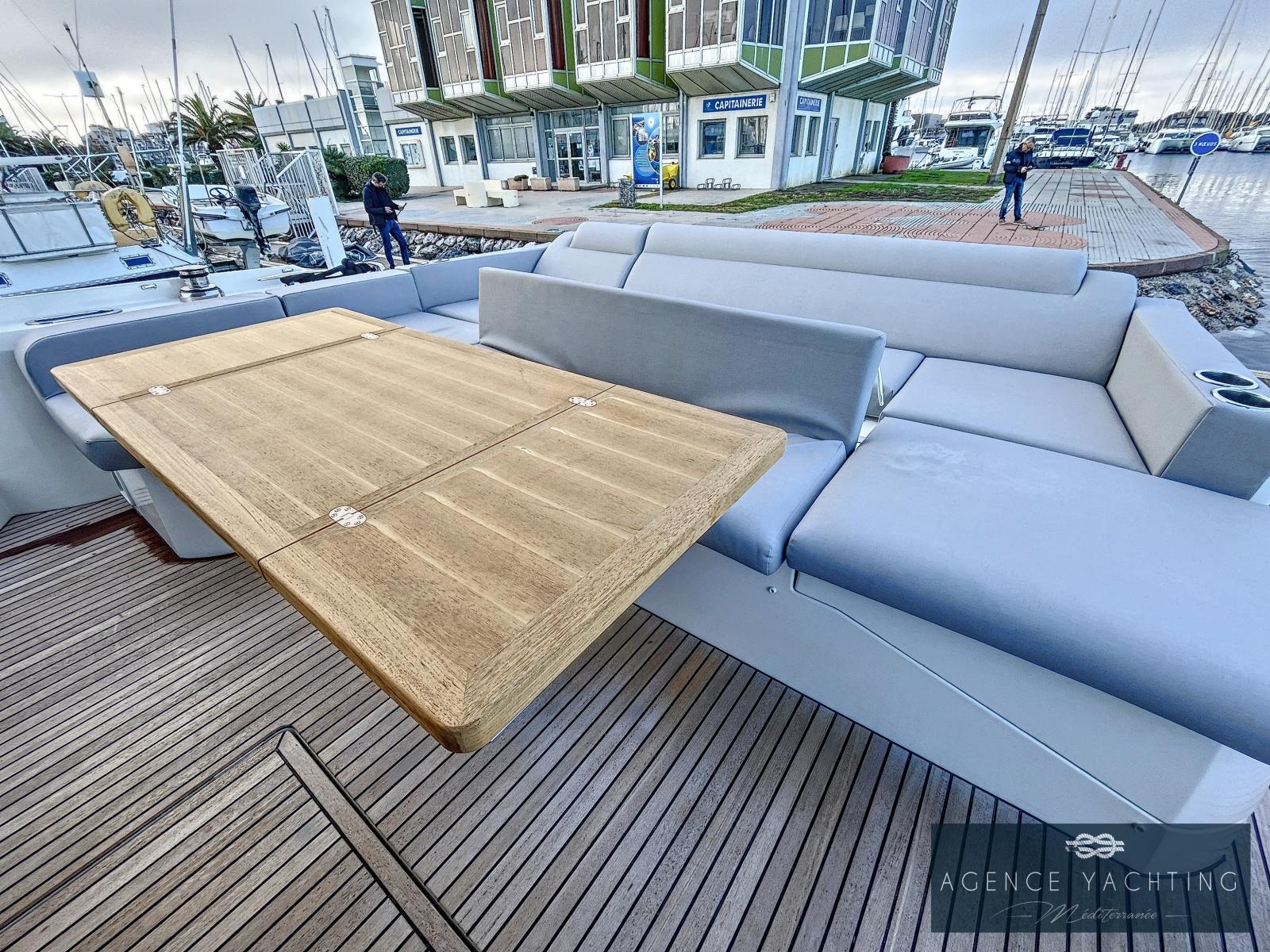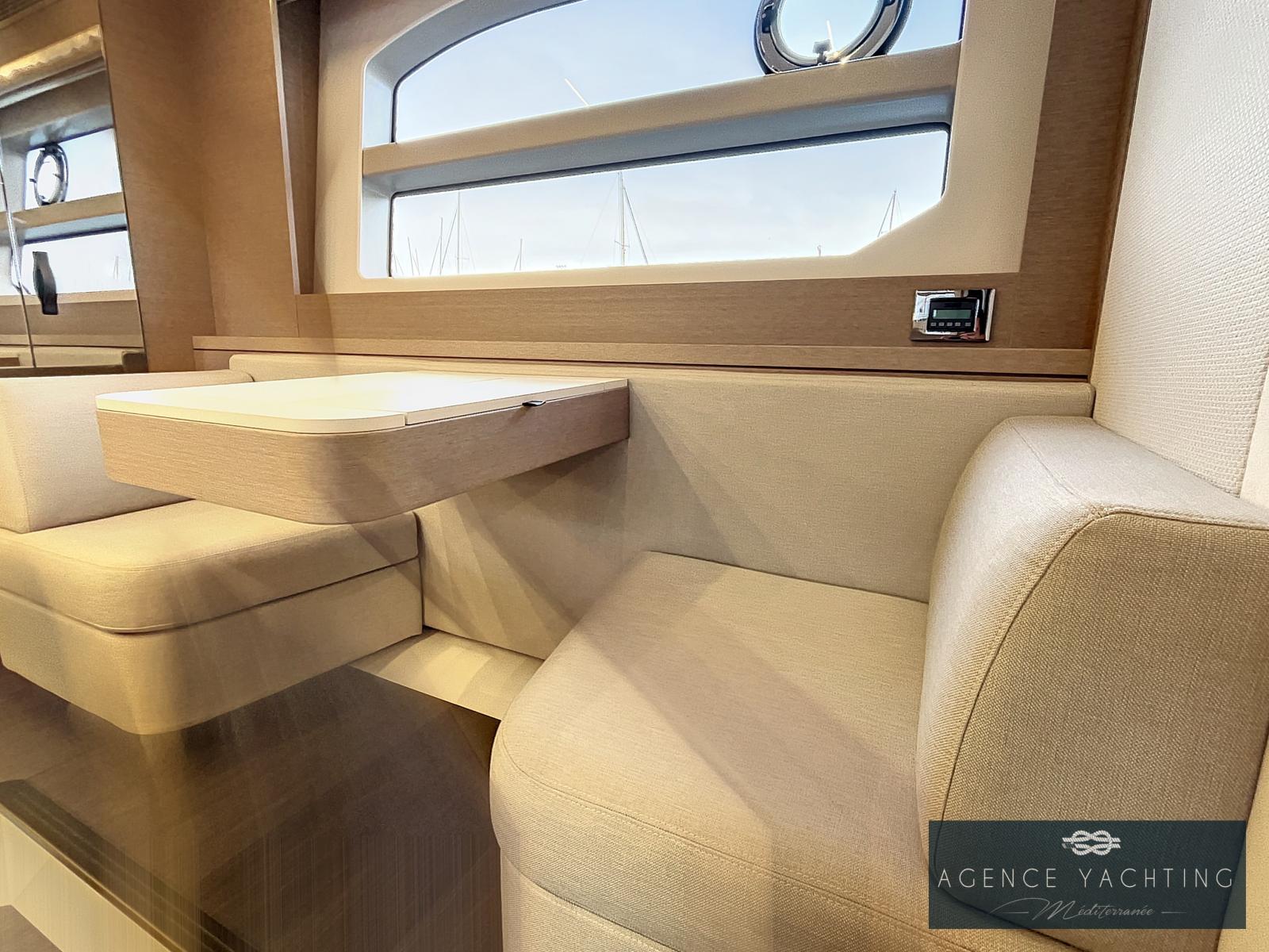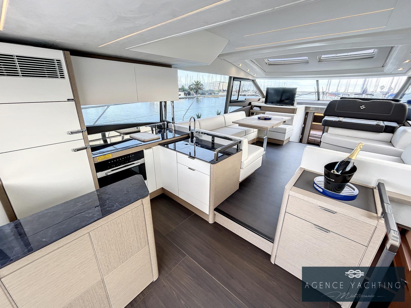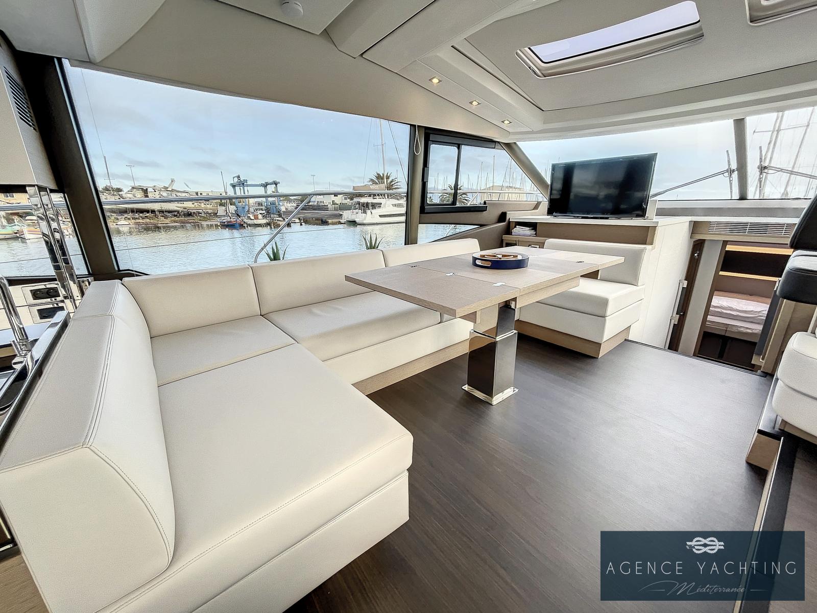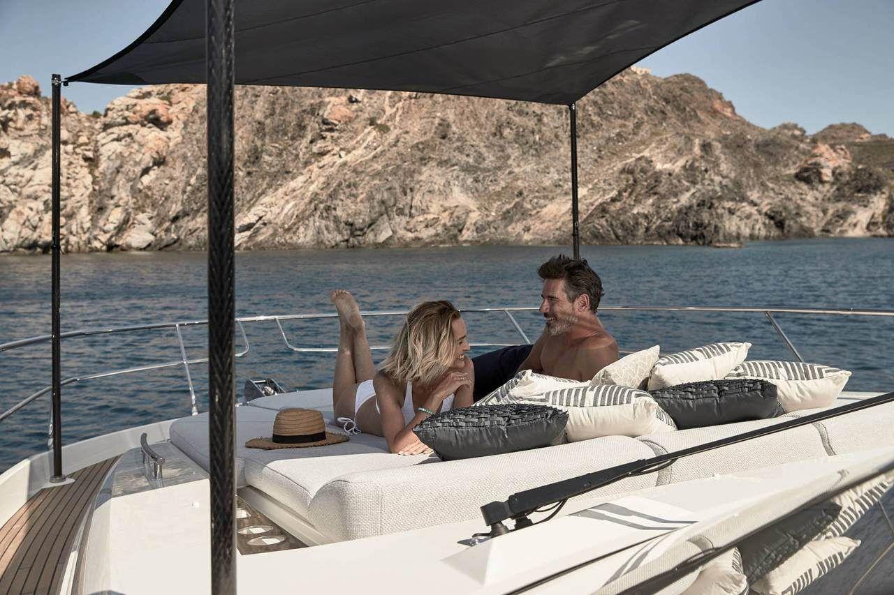 Un yacht sportif, élégant, comportant un grand toit électrique ouvrant sur le salon ainsi qu’un très grand Fly.