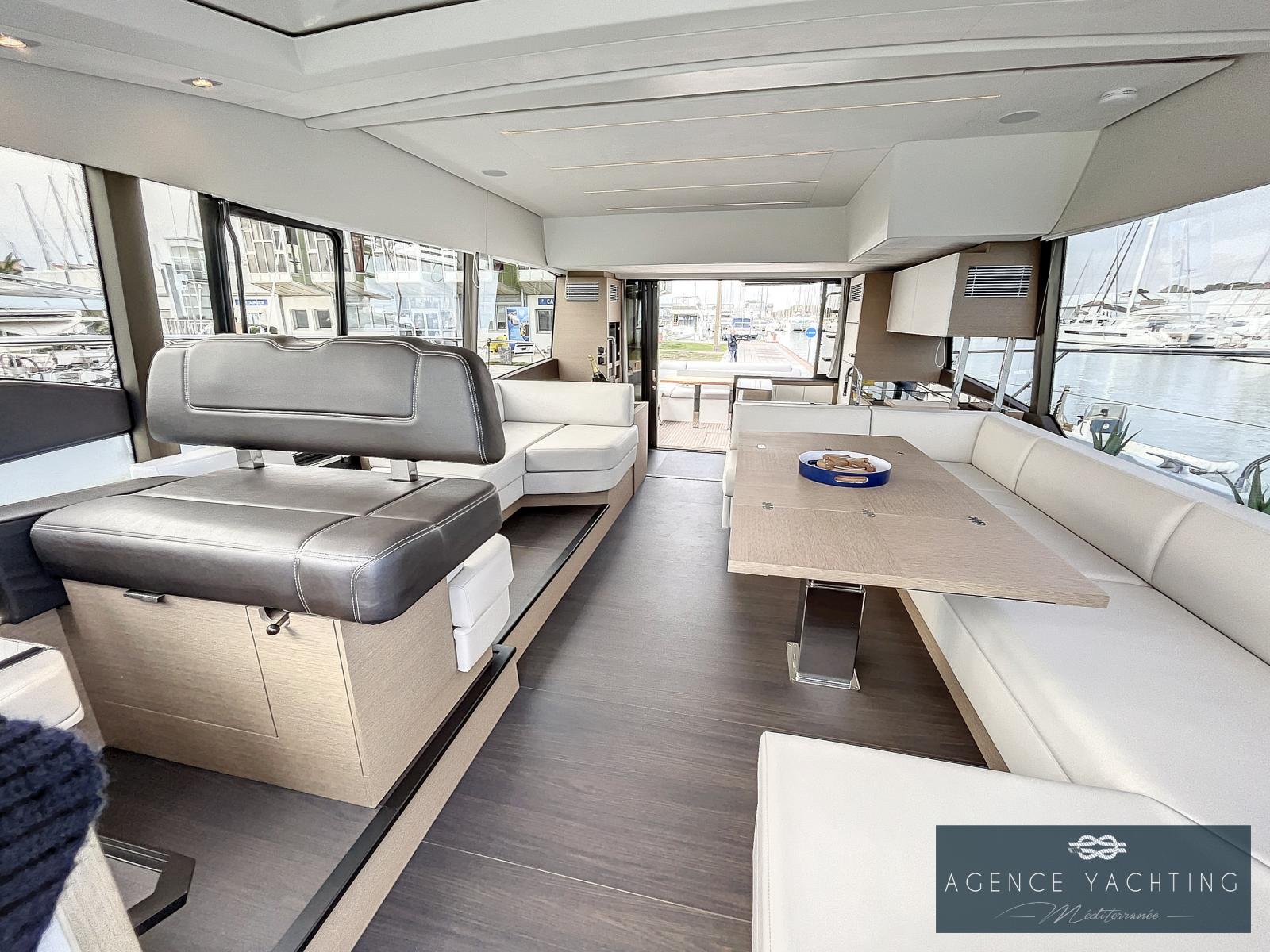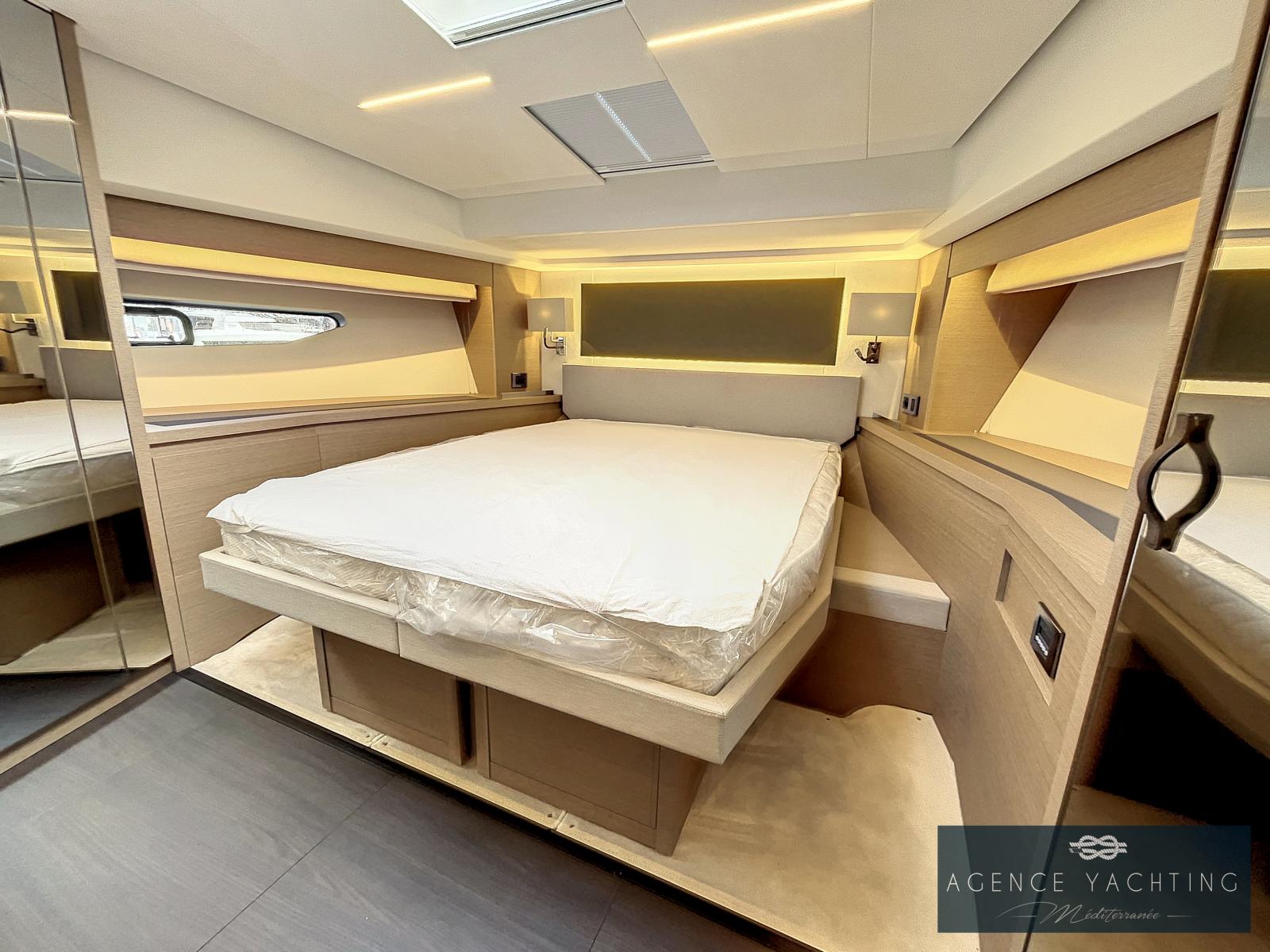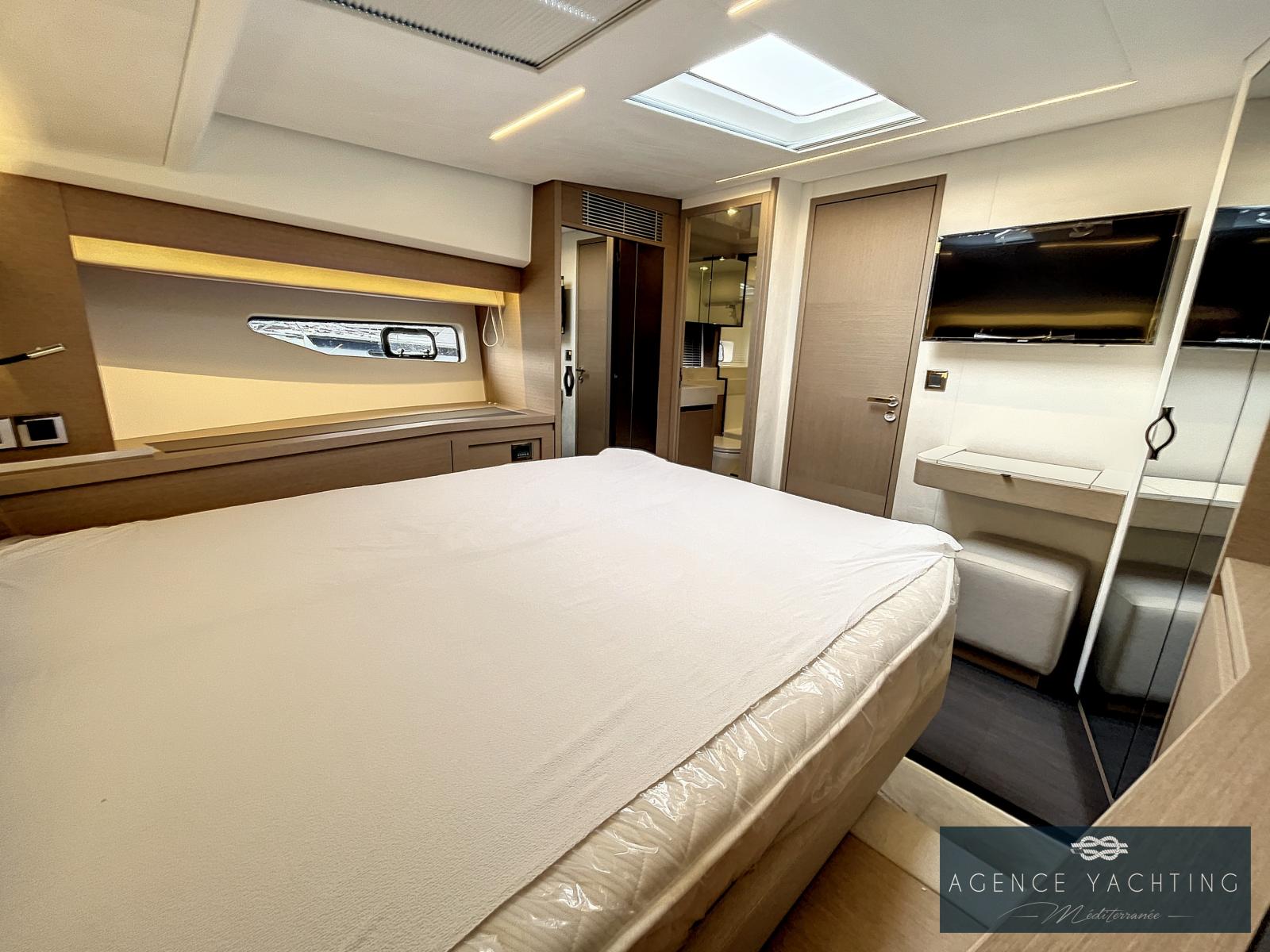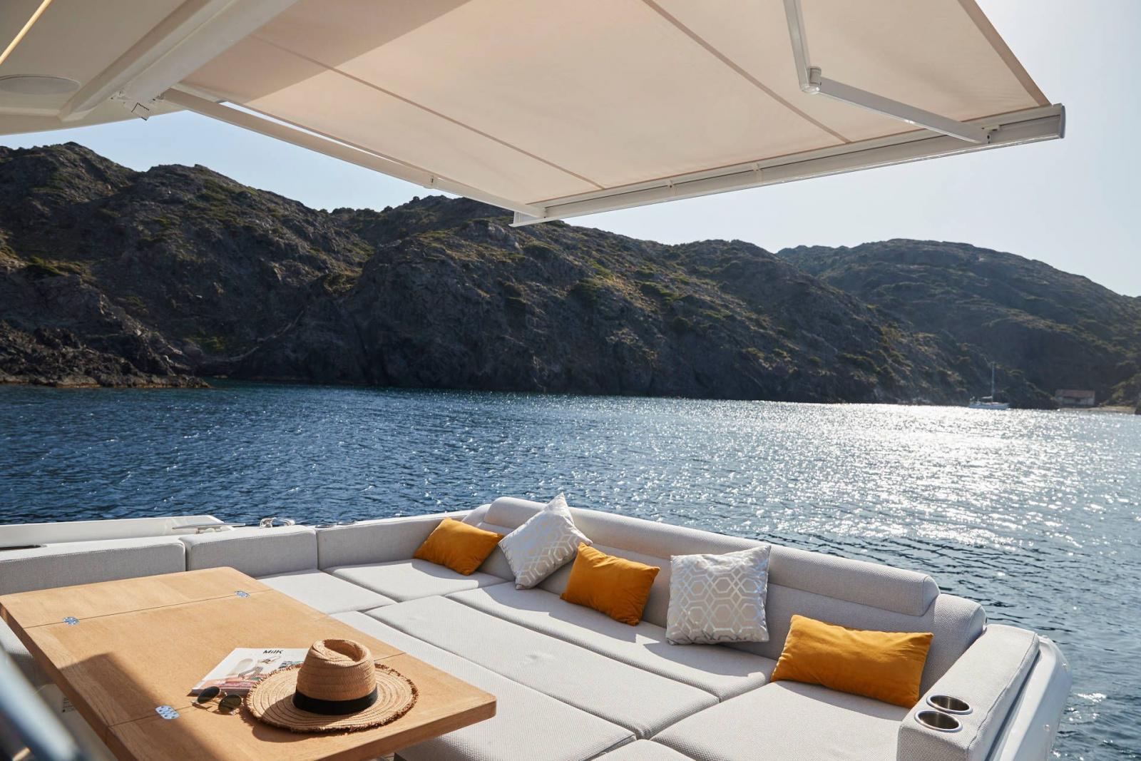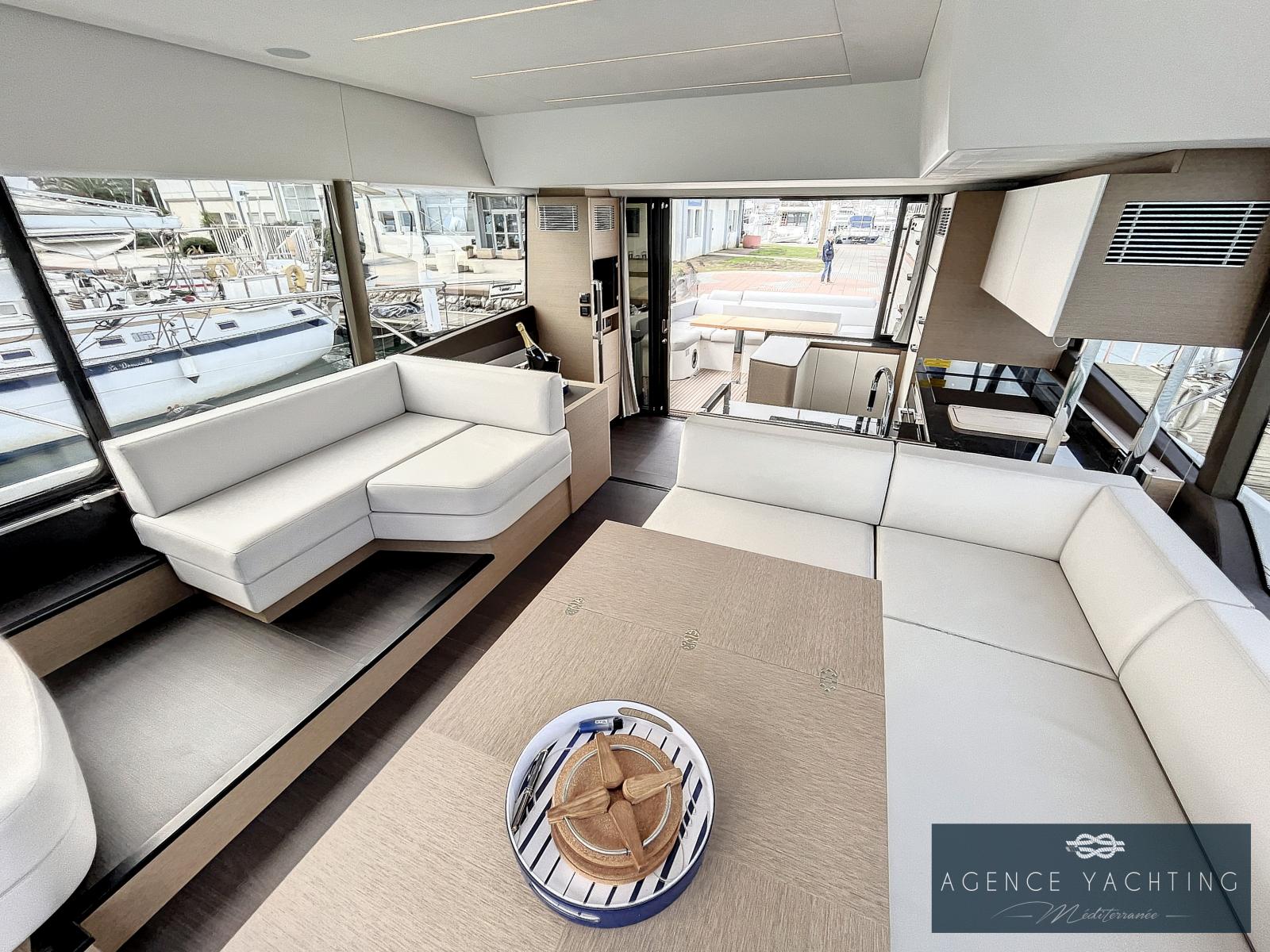 Un yacht sportif, élégant, comportant un grand toit électrique ouvrant sur le salon ainsi qu’un très grand Fly.