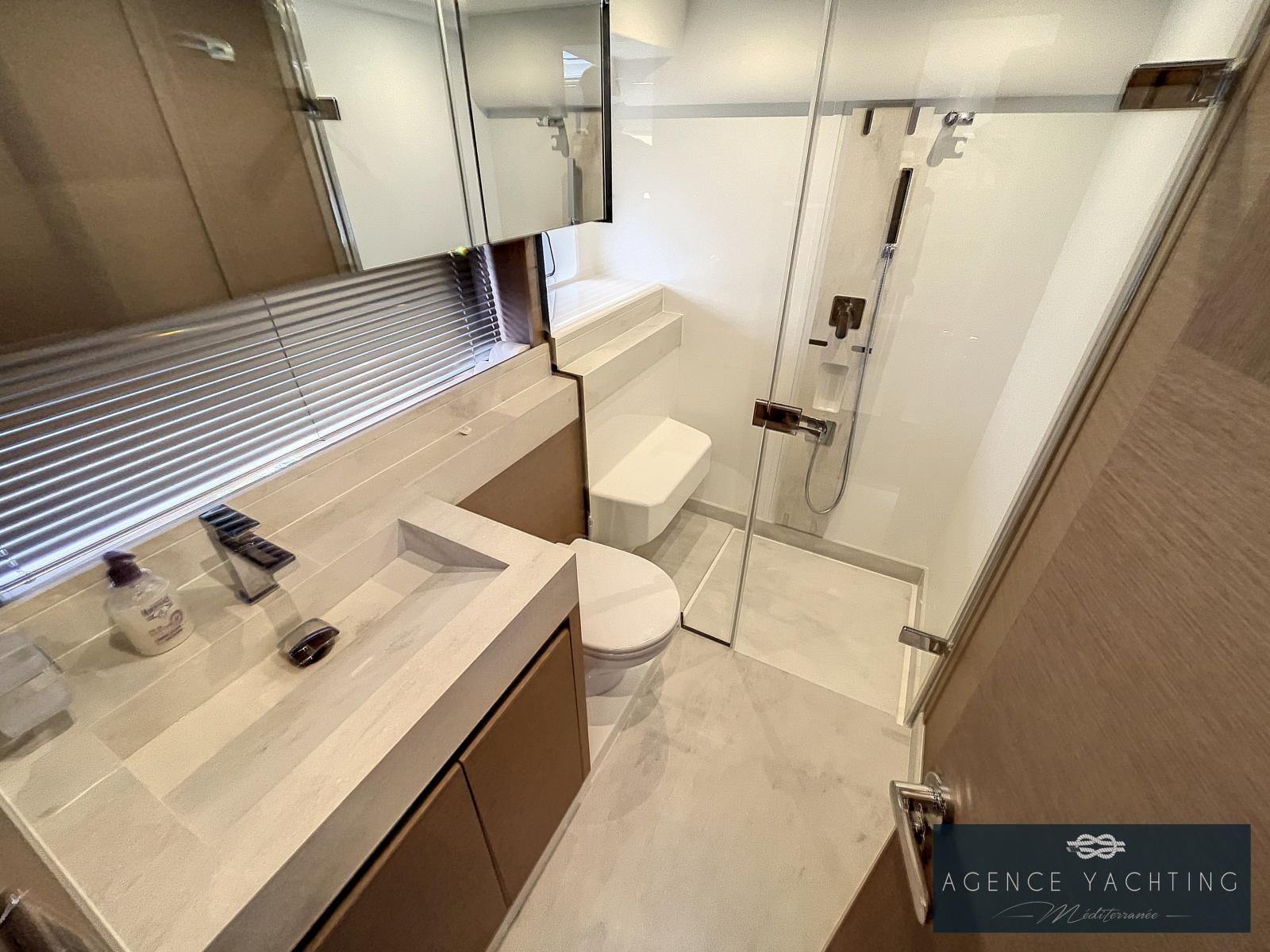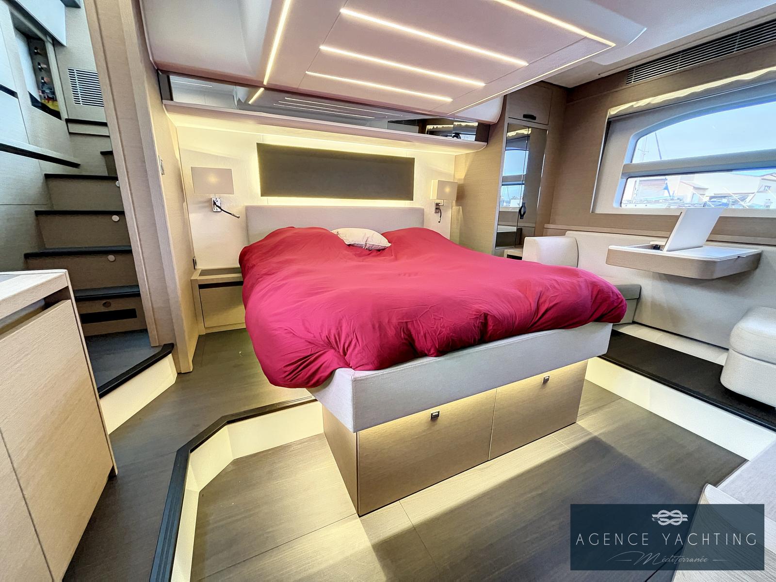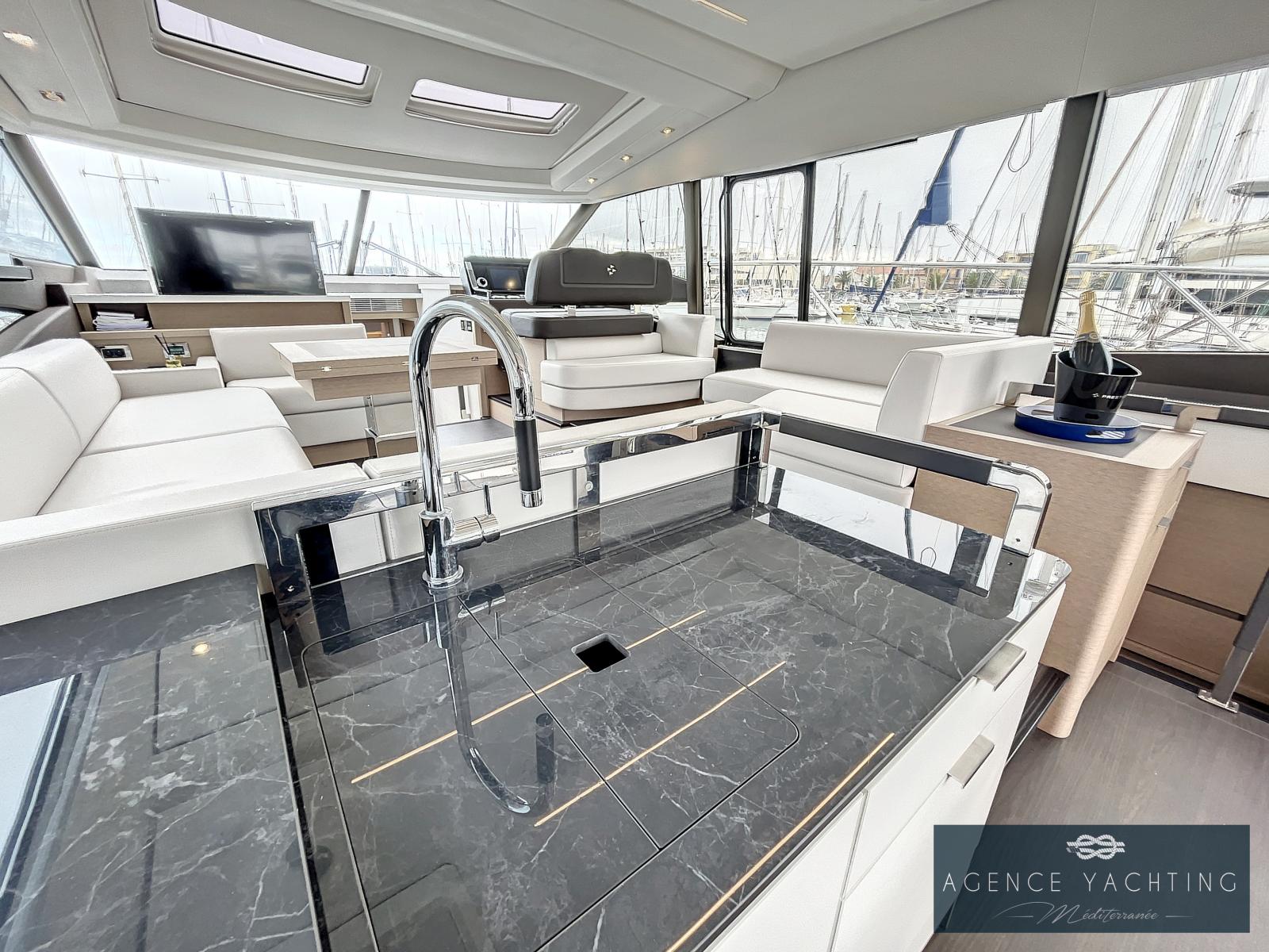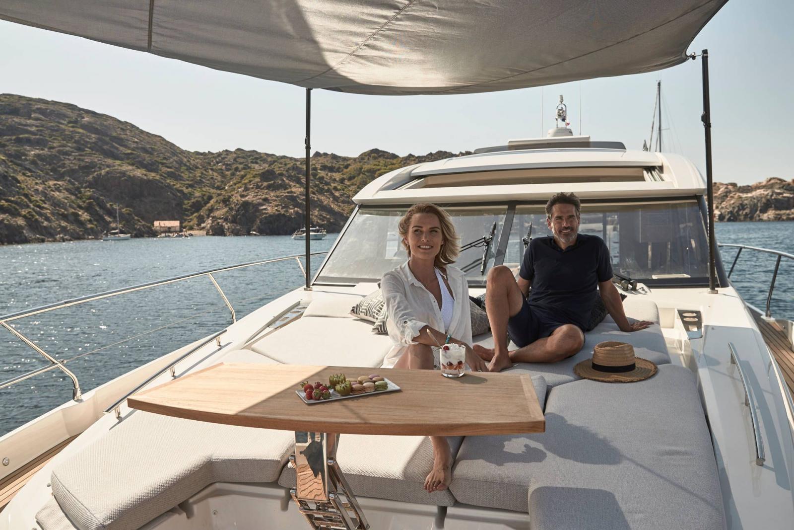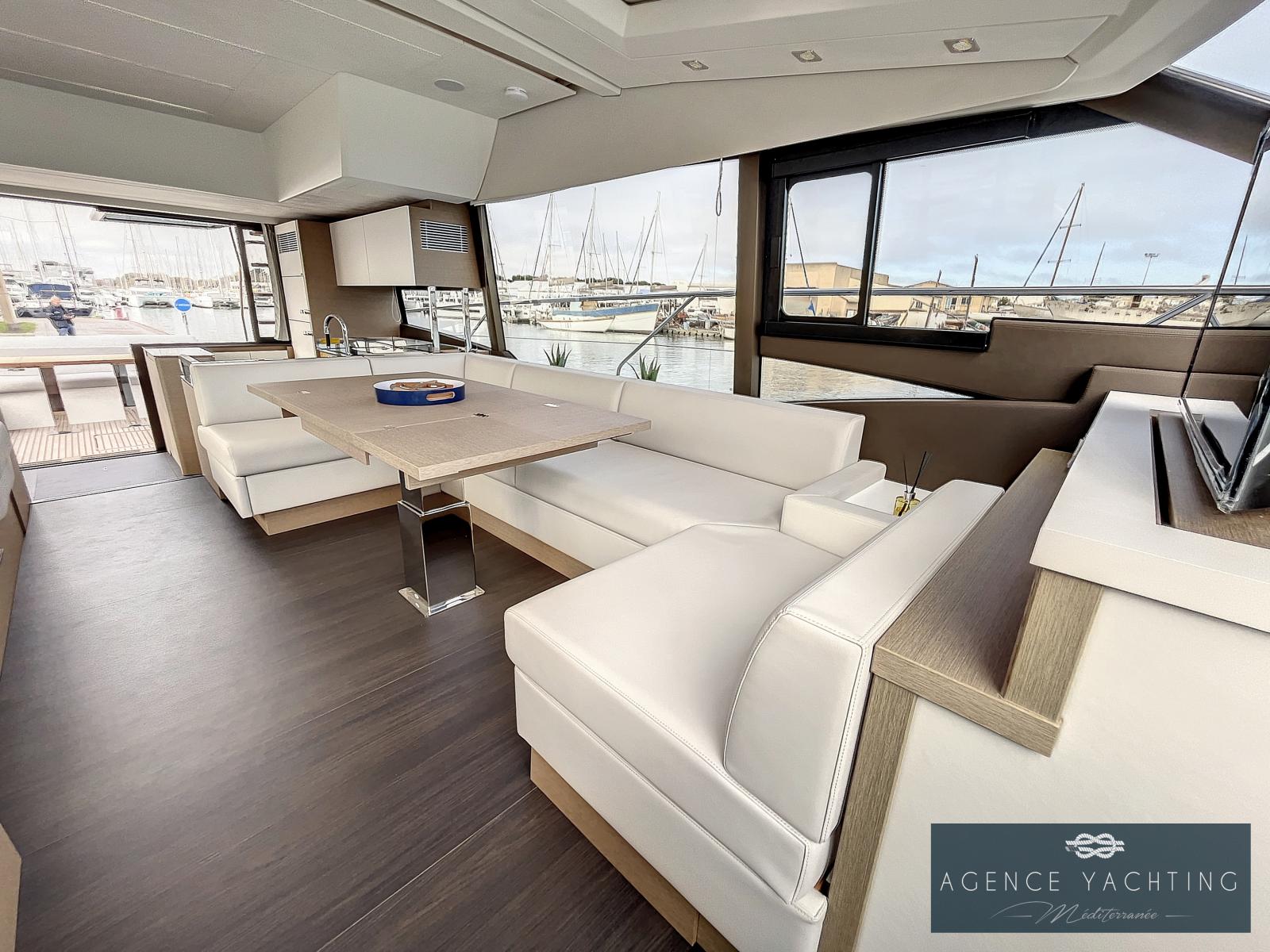 Un yacht sportif, élégant, comportant un grand toit électrique ouvrant sur le salon ainsi qu’un très grand Fly.