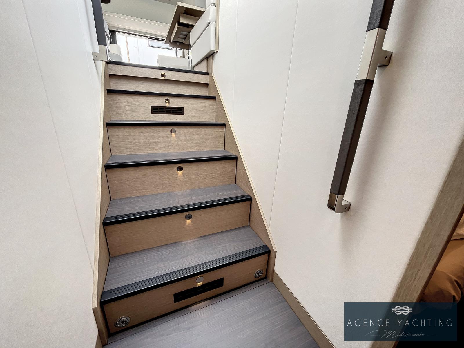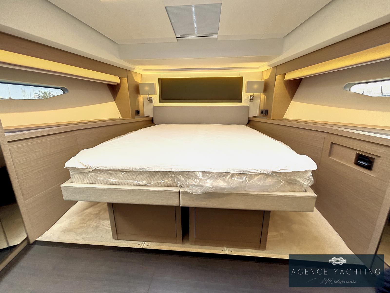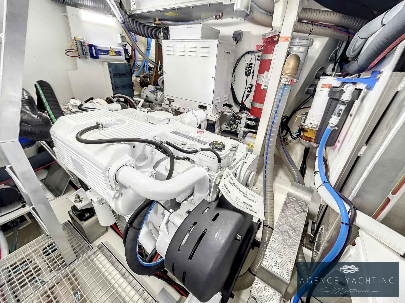 La PRESTIGE 590S possède une motorisation optimisée et maîtrisée grâce à ses doubles moteurs CUMMINS 600 CV équipés de PODS ZEUS. Cette configuration inhérente à la carène en V évolutif permet des manoeuvres facilitées avec le joystick. Ce couple idéal carène - propulsion réduit le bruit et les vibrations ainsi que la consommation du yacht.
