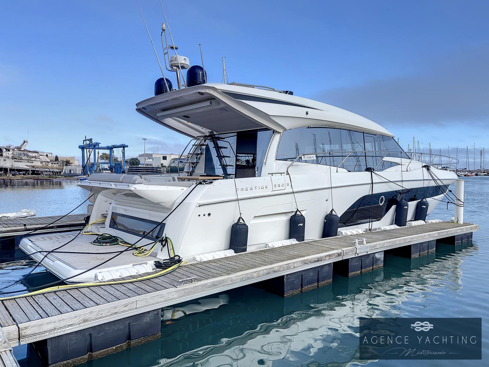 La PRESTIGE 590S se remarque par son design dynamique et raffiné, signé GARRONI Design. La carène, puissante, assure un comportement en mer fiable. La coque, large et élancée, bénéficie d’immenses vitrages de coque.